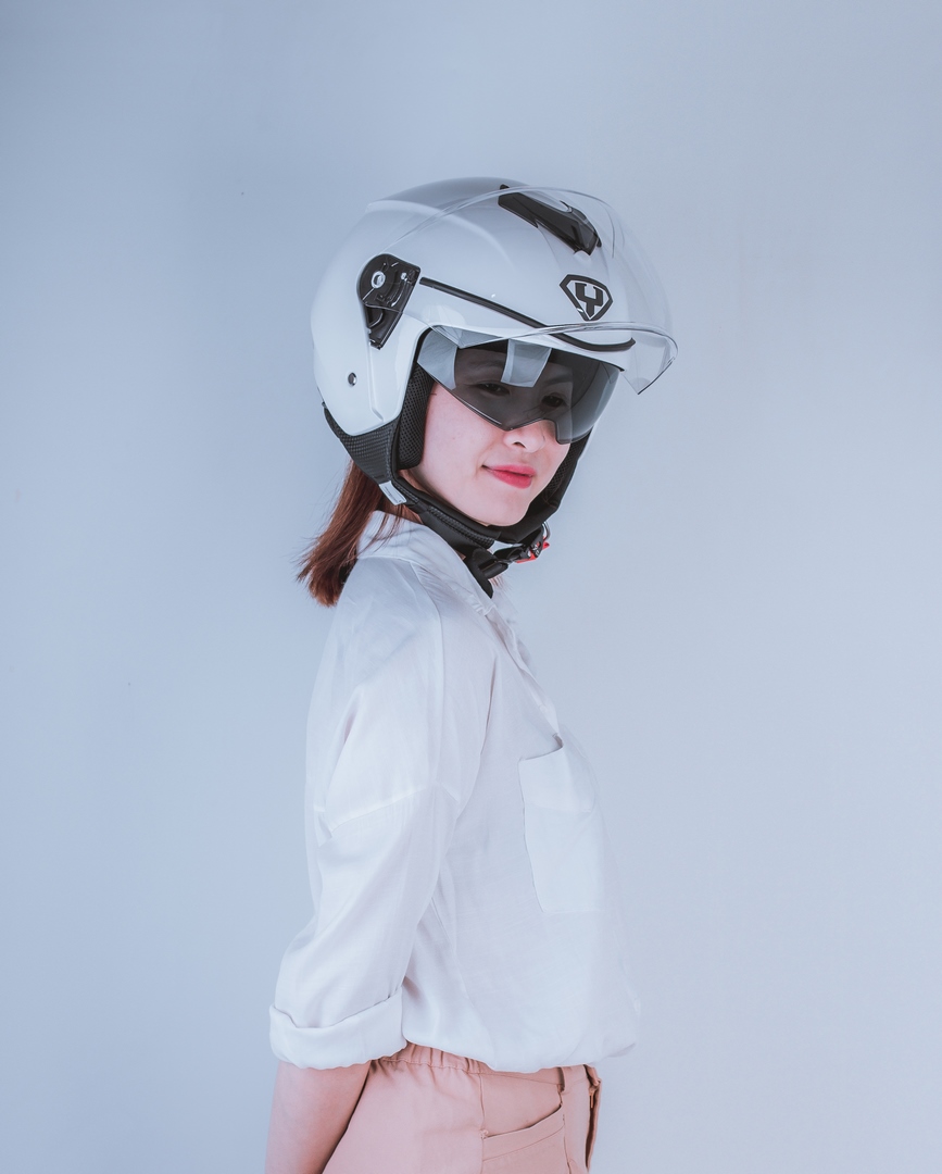 THIẾT KẾ THÔNG MINH - Phong cách thiết kế: mũ kiểu 3/4 kèm kính dài, mũ được thiết kế dáng tròn, đi kèm 2 miếng ốp má, giúp tăng thêm hiệu quả bao phủ, bảo