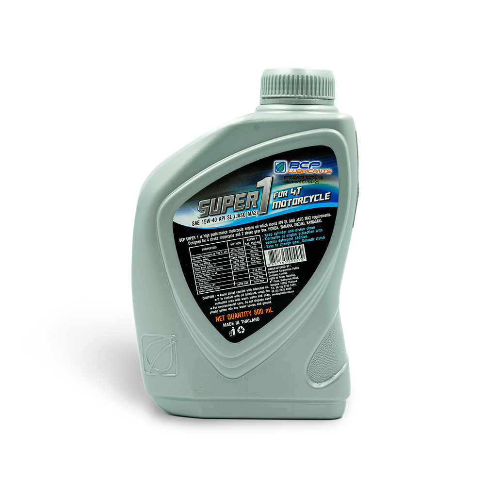 Nhớt xe số BCP Super 1 - SAE 15W40 - API SL - JASO MA2 – chai 800 mL BCP Super 1 4T Motorcycle là sản phẩm dầu nhớt đa cấp tổng hợp chuyên dùng