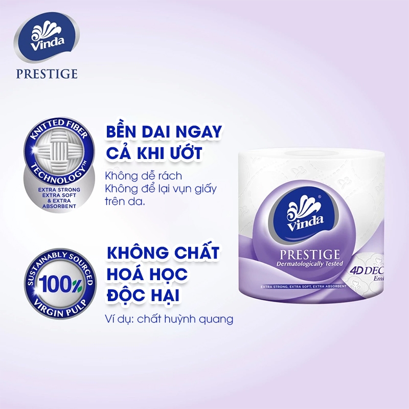 Giấy vệ sinh cao cấp Vinda Prestige 4D được sản xuất từ 100% bột giấy nguyên sinh, không hóa chất tẩy độc hại, an toàn cho cả làn da nhạy cảm. Giấy vệ sinh có kết cấu bền dai ngay cả khi ướt, không để lại vụn giấy khi sử dụng, giúp bạn luôn cảm thấy dễ chịu và sạch sẽ sau mỗi lần dùng.