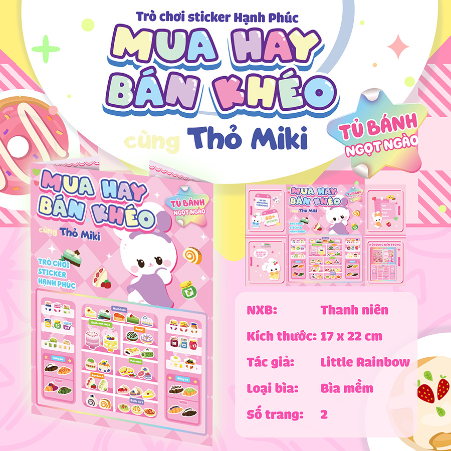 Mua hay bán khéo gồm 5 tập khác nhau với gian hàng khác nhau cùng các bạn Gấu, Thỏ, Vịt. Mỗi tập bao gồm 60+ stickers an toàn và siêu đáng yêu. 5 tập này sẽ là người bạn đồng hành tuyệt vời cho sự sáng tạo và trí tưởng tượng của các bé.