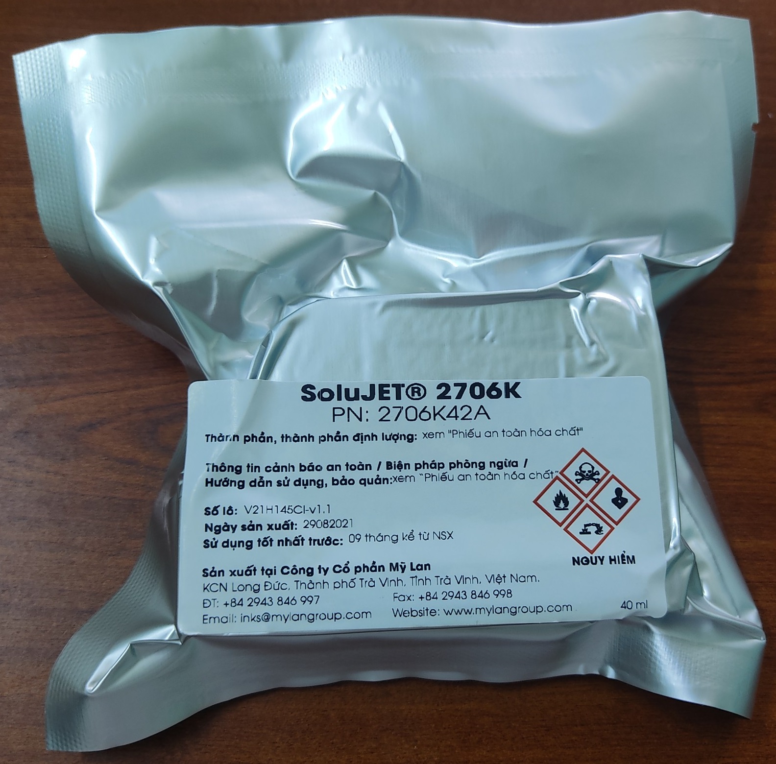 - SoluJET 2706K - Mực dung môi TIJ 2.5 được thiết kế để in ấn nhãn mác, hạn sử dụng, mã vạch và các ứng dụng, mã vạch và các ứng dụng in công nghiệp năng suất cao như in ấn bao bì, thư từ, các loại vé.