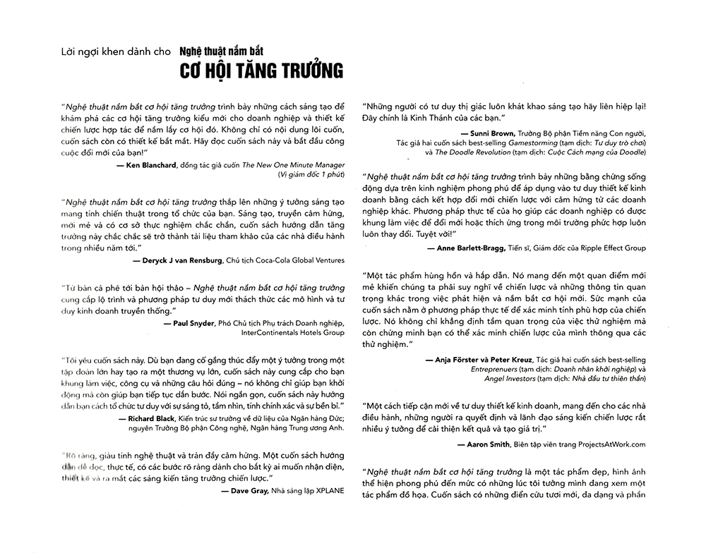 Khám phá và đầu tư vào những cơ hội tăng trưởng chưa bao giờ là bài toán dễ giải, đặc biệt là với các tổ chức đã hoạt động ổn định, bị bó hẹp trong lối tư duy lỗi thời hoặc các mô hình kinh doanh truyền thống. Nghệ thuật nắm bắt cơ hội tăng trưởng sẽ cung cấp cho bạn một lộ trình ngắn nhất để nhận diện, thiết kế và ra mắt các sáng kiến tăng trưởng chiến lược. Marc, Parker và Matt đã xây dựng một hành trình hấp dẫn, nội dung phong phú dành cho bất kỳ ai theo đuổi mục tiêu tăng trưởng mới. Và trong quá trình giới thiệu những cách tư duy mới về chiến lược tăng trưởng và đổi mới chiến lược, ví dụ như nội dung về nhóm phi khách hàng, bản chất nhu cầu của khách hàng cùng các thành tố tạo nên mô hình kinh doanh và mô hình doanh thu, họ cũng giới thiệu với chúng ta những cách làm việc mới. Phương pháp tư duy thị giác và các nguyên tắc tư duy thiết kế kinh doanh khác được thể hiện xuyên suốt cuốn sách sẽ giúp bạn cải thiện cách tiếp cận vấn đề thiết kế và thực hiện chiến lược để phát triển hoạt động kinh doanh tăng trưởng mới. Với sự hỗ trợ của hình ảnh, các công cụ và biểu mẫu, bạn sẽ áp dụng phương pháp này theo đúng nhu cầu của mình. Cuốn sách chia làm 5 chương, giúp từng bước hiểu và xây dựng được cho mình một chiến lược tăng trưởng kiểu mới: Chương 1: Giúp bạn hiểu Chiến lược đổi mới là gì đặt trong sự đối sánh với chiến lược kiểu truyền thống; và 5 nguyên tắc quan trọng của tư duy thiết kế kinh doanh. Đây là những câu hỏi căn bản để bạn thực sự bước chân vào lãnh địa đổi mới chiến lược. Chương 2: Giúp bạn khám phá các cơ hội tăng trưởng kiểu mới bằng việc hiểu rõ nhóm khách hàng và phi khách hàng. Điều quan trọng không kém là hiểu về chính doanh nghiệp của bạn. Từ đó xây dựng khung làm việc cho các sáng kiến và cơ hội tăng trưởng kiểu mới. Chương 3 : Giúp bạn bắt tay vào thiết kế bản chiến lược. Cụ thể là thiết kế chính sản phẩm mà bạn chào bán, xác định mô hình kinh doanh và mô hình doanh thu cho doanh nghiệp mình. Từ đó xác lập chiến lược tăng trưởng cụ thể bằng cách tạo giá trị cho khách hàng, doanh nghiệp và hệ sinh thái. Thể hiện chiến lược dưới dạng hình ảnh cũng là một nghệ thuật cần được quan tâm. Chương 4 : Đi sâu vào 3 giai đoạn thử nghiệm và ra mắt hoạt động kinh doanh tăng trưởng, bao gồm : khởi đầu, phát triển và mở rộng. Chương 5 : Giúp bạn làm chủ nghệ thuật nắm bắt cơ hội tăng trưởng bằng tư duy thiết kế kinh doanh. 5 nguyên tắc của tư duy thiết kế kinh doanh sẽ được làm rõ bằng các dẫn chứng và ví dụ minh họa. Mỗi chương đều có phần hoạt động dành cho các nhóm trong doanh nghiệp để thực hành lý thuyết. Kèm với đó là các doanh nghiệp truyền cảm hứng như Microsoft, Oracle, ProSiebenSat.1, Fahrenheit 212, Câu chuyện của họ thực sự là những bài học hữu ích cho các doanh nghiệp đang cố gắng đổi mới chiến lược tăng trưởng .