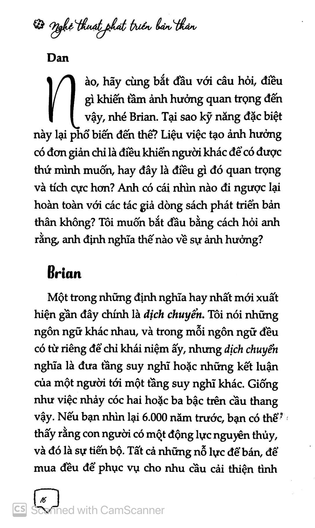 Với cuốn sách Nghệ thuật phát triển bản thân, Dan Strutzel và Bryan Tracy sẽ bàn về cách phát triển bản thân thông qua những kỹ năng tạo ảnh hưởng, từ đó giúp bạn tạo ra những kết quả đáng kinh ngạc như mối quan hệ cá nhân hạnh phúc hơn, bán hàng tốt hơn, tạo ra những mối quan hệ đối tác có lợi hơn cũng như hoàn thành những mục tiêu quan trọng nhất đối với bạn. Không chỉ dừng lại ở đó, cuốn sách còn giúp bạn thấy rằng thật sự có khoa học về tầm ảnh hưởng, một cơ sở khoa học đã được kiểm định và chứng minh nhiền lần, không phải chỉ trong vài năm hay vài thập kỉ, mà cả nghìn năm nay. Mục tiêu của cuốn sách này là mang đến cho bạn thật nhiều sự thật đã được kiểm chứng về tầm ảnh hưởng, loại bỏ những lời đồn đoán cũng như mớ lý thuyết nửa mùa, và đem đến cho bạn một kho tàng ý tưởng để có thể trở thành nguồn cảm hứng trong chính cuộc đời m.ình cũng như cuộc đời của những người mà bạn quan tâm.