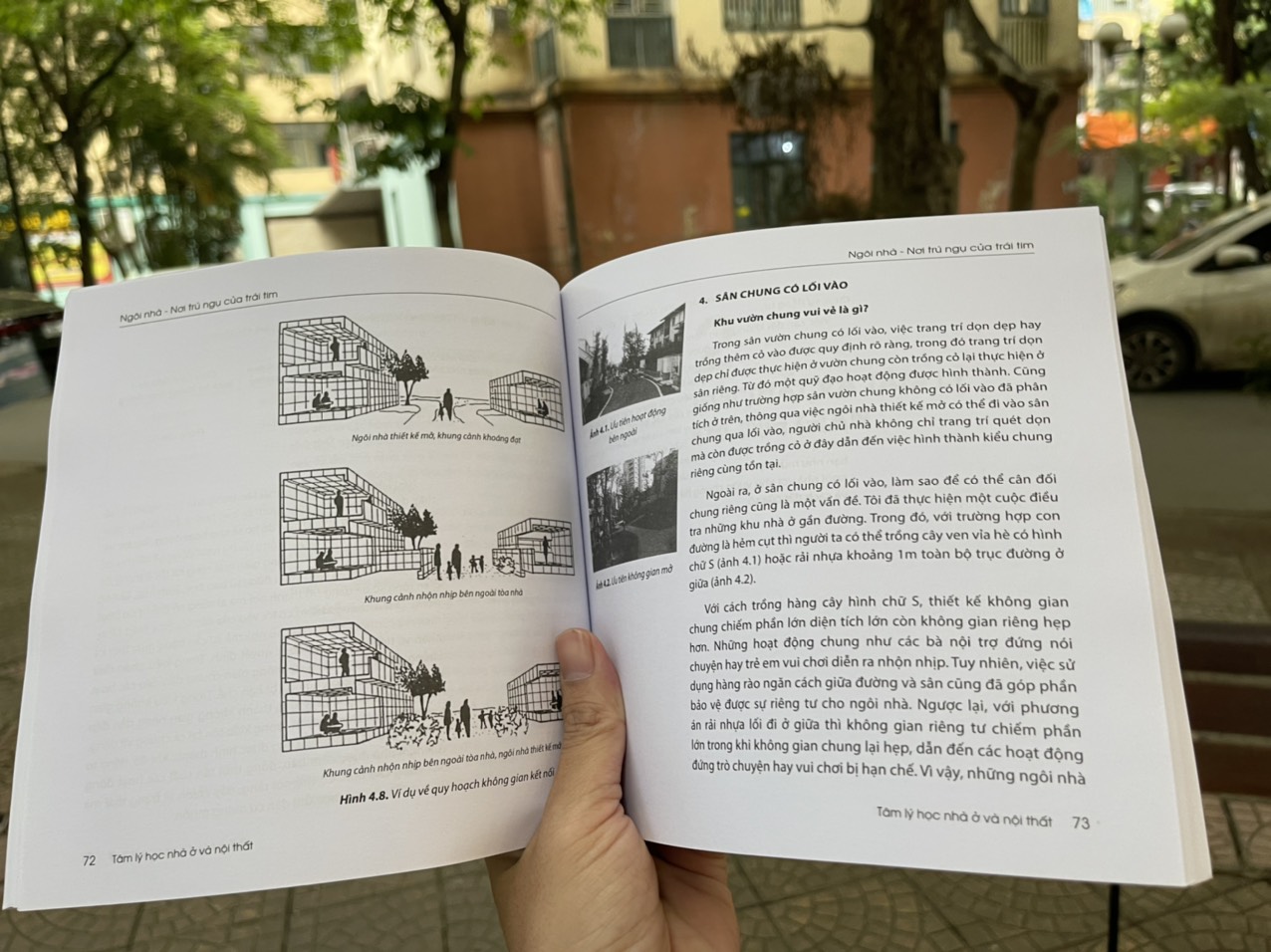 Về tâm lý giữa con người với con người, tôi chọn sự riêng tư trong khu dân cư để làm đối tượng điều tra và đây cũng chính là mấu chốt của toàn bộ nghiên cứu này. Đầu tiên, riêng tư là vấn đề về cái nhìn giữa con người với con người, được điều chỉnh bằng sự khách khí dựa vào mối quan hệ thứ bậc, hay bằng cảm giác an tâm dựa vào mức độ thân thiết. Mối quan hệ thứ bậc được xác định bởi thứ tự của vị trí đứng và phân chia ranh giới (lãnh thổ). Cụ thể, nếu lúc nào chúng ta cũng sinh hoạt và trông coi phía trước nhà mình thì dần dần sẽ hình thành ranh giới. Từ đó, những người lạ đi qua sẽ bắt đầu ngại ngùng với ranh giới đã được chúng ta tạo ra, đồng thời khiến ta cảm thấy có uy thế hơn họ. Quan điểm này chính là “tiếp điểm” nghiên cứu giữa cách thức sử dụng và tâm lý, từ đó lý giải các vấn đề về tâm lý của người dùng. Nhờ thiết kế mở cho ngôi nhà mà quan điểm vừa bảo vệ được sự riêng tư vừa xây dựng được khu dân cư với bầu không khí vui tươi, nhộn nhịp đã ra đời, từ đó giúp tôi có thể mạnh dạn đưa ra một số phương án thiết kế cho những ngôi nhà trung tầng và cao tầng….