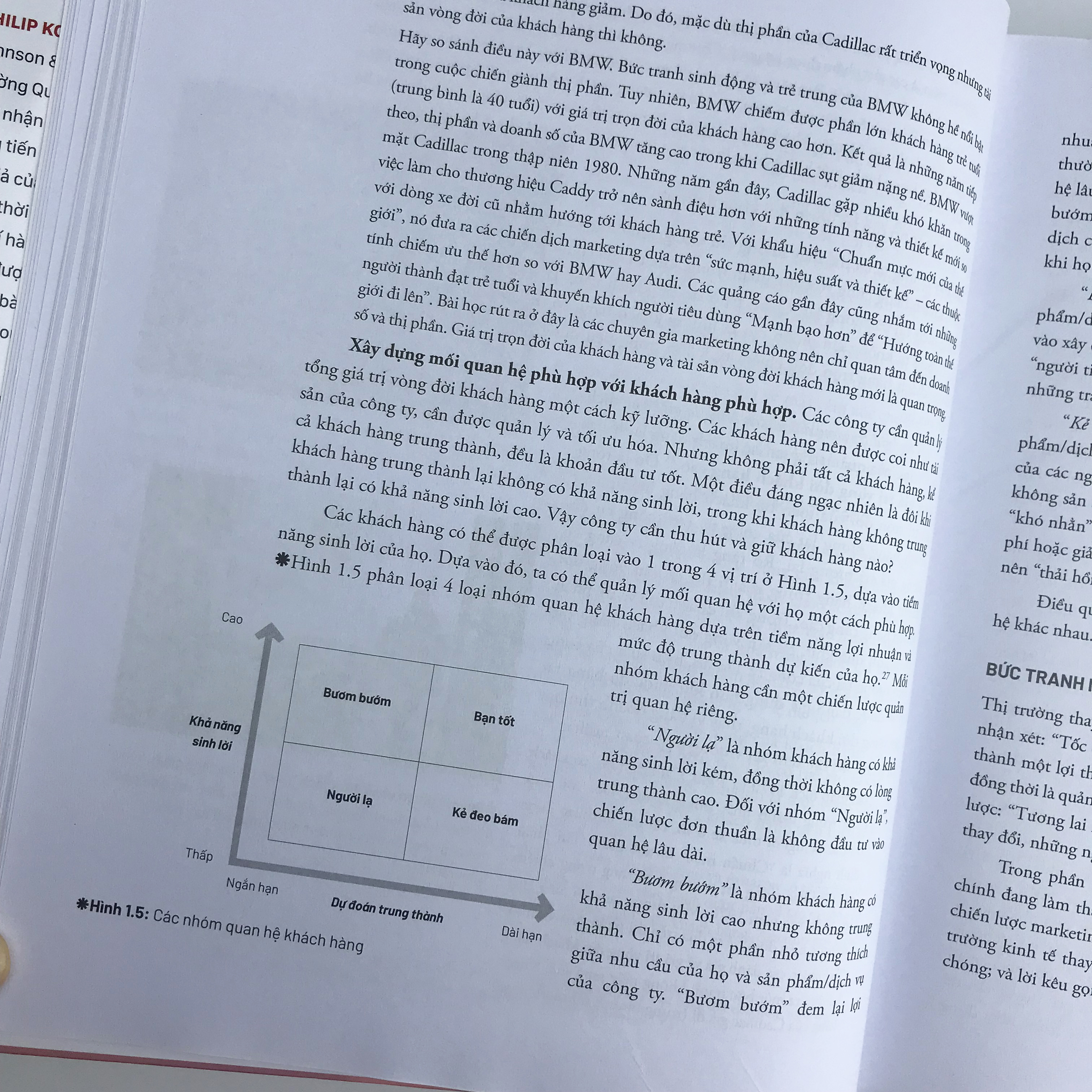 • Và nhiều kiến thức giá trị tuyệt vời khác về Marketing Sách Nguyên lý Marketing (Phiên bản mới nhất 2021) MỘT SỐ TRÍCH ĐOẠN NỔI BẬT: Nói về khái niệm marketing: “Ngày nay, không nên hiểu marketing theo định nghĩa cũ là thực hiện một thương vụ bán hàng – “chào hàng và bán hàng”, mà theo một cách hiểu mới, nó chính là thỏa mãn nhu cầu khách hàng. Nếu nhà marketing thu hút người tiêu dùng hiệu quả, hiểu nhu cầu của họ, phát triển các sản phẩm mang lại giá trị vượt trội và có ưu thế về giá, phân phối và quảng bá sản phẩm tốt, sản phẩm sẽ được bán dễ dàng. Trên thực tế, theo bậc thầy quản trị Peter Drucker: “Mục đích của marketing là làm cho khâu bán hàng trở nên không cần thiết.” Bán hàng và quảng cáo chỉ là một phần của “marketing hỗn hợp” rộng lớn hơn – một bộ công cụ marketing cùng vận hành để thu hút khách hàng, đáp ứng nhu cầu của khách hàng và xây dựng mối quan hệ với khách hàng” Nói về môi trường marketing: “Môi trường marketing của một doanh nghiệp bao gồm các yếu tố và áp lực bên ngoài tác động đến khả năng xây dựng và duy trì mối quan hệ tốt đẹp với khách hàng mục tiêu. Cũng giống như Kellogg, các doanh nghiệp phải liên tục quan sát và thích nghi với môi trường luôn thay đổi – hoặc trong nhiều trường hợp là dẫn dắt những thay đổi đó. Hơn tất cả các bộ phận khác trong doanh nghiệp, những người làm marketing phải là những người chuyên theo dõi xu hướng của môi trường. Mặc dù mỗi nhà quản lý trong doanh nghiệp đều cần phải quan sát môi trường bên ngoài, song người làm marketing cần phải có hai khả năng đặc biệt. Họ phải rèn luyện các phương pháp – nghiên cứu marketing và thu thập thông tin marketing – để thu thập thông tin và thấu hiểu môi trường marketing. Họ cũng phải dành nhiều thời gian hơn để hiểu môi trường của khách hàng và đối thủ cạnh tranh. Bằng việc nghiên cứu kỹ lưỡng môi trường, người làm marketing có thể lập các chiến lược phù hợp với các cơ hội và thách thức của thị trường mới” Nói về vai trò của đạo đức trong marketing: “Càng ngày, các công ty càng cần cung cấp chính sách và hướng dẫn để giúp quản lý của họ giải quyết những vấn đề về đạo đức marketing. Tất nhiên, ngay cả hướng dẫn chi tiết nhất cũng không thể giải quyết và giúp các cá nhân cũng như tổ chức đưa ra quyết định trong tất cả những vấn đề về đạo đức. Nhưng có một số nguyên tắc mà người làm marketing có thể lựa chọn. Nguyên tắc thứ nhất cho rằng thị trường tự do và hệ thống pháp lý nên quyết định những vấn đề như vậy. Nguyên tắc thứ hai tiến bộ hơn đặt trách nhiệm không phải vào hệ thống mà vào tay công ty và cá nhân các nhà quản lý. Mỗi công ty và giám đốc marketing phải xây dựng triết lý về hành vi đạo đức và trách nhiệm xã hội. Theo khái niệm marketing bền vững, các nhà quản lý phải nhìn xa hơn những gì hợp pháp và được phép; đồng thời phát triển các tiêu chuẩn dựa trên sự chính trực cá nhân, lương tâm công ty và phúc lợi tiêu dùng lâu dài.” Cuốn sách sẽ là nguồn tài liệu hữu ích, dẫn dắt bạn bước vào thế giới hấp dẫn của marketing hiện đại một cách đầy đủ và tiêu chuẩn nhưng cũng đầy mới mẻ, thực tế và hấp dẫn. Trở thành kim chỉ nam cho các doanh nghiệp có hướng đi tối ưu trong các hoạt động marketing của mình. Bản mới nhất 2021 (Phiên bản thứ 17) - Nguyên lý Marketing THÔNG TIN BỔ SUNG VỀ CUỐN SÁCH NGUYÊN LÝ MARKETING: Công ty phát hành: Alpha Books Tác giả: Philip Kolter, Gary Armstrong Người Dịch: Nhóm dịch khoa Marketing - Trường Đại học Kinh tế Quốc dân NXB: NXB Trường Đại học Kinh tế Quốc dân Năm XB: 2021 Số trang: 1080 Hình thức: Bìa Cứng