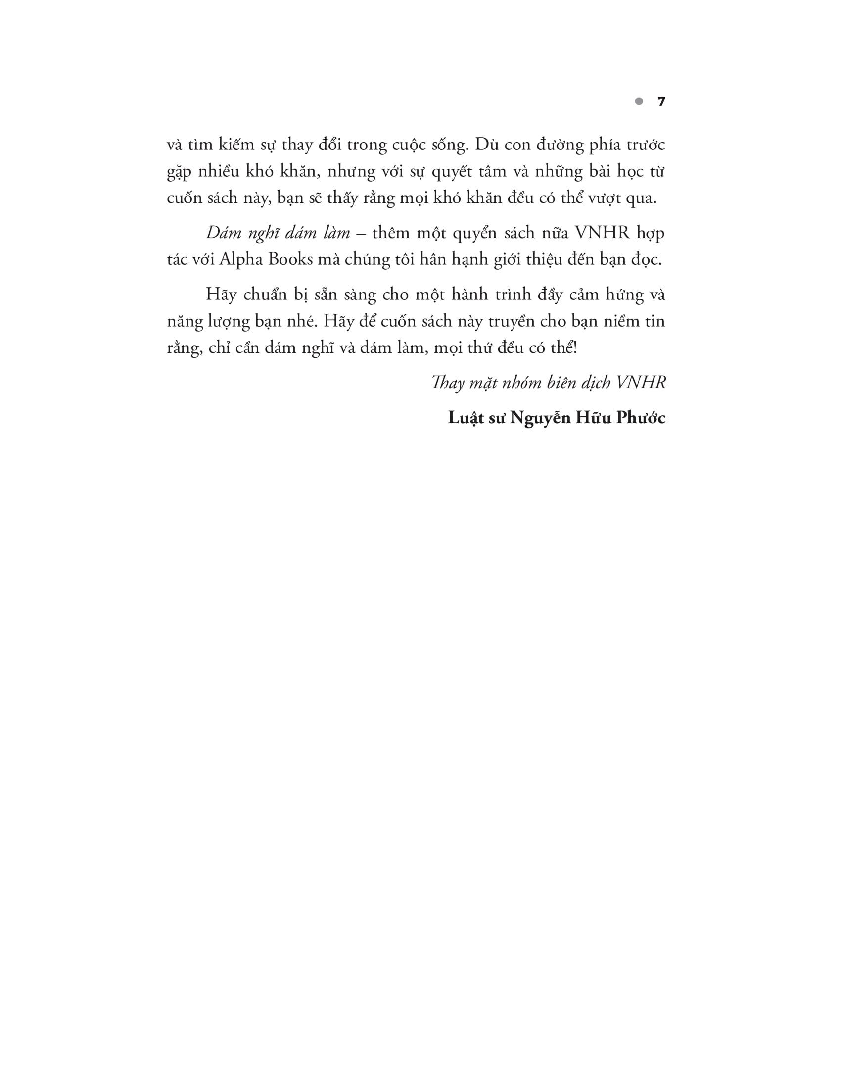 - Bất kỳ ai muốn đạt được mục tiêu lớn: Dù bạn đang làm việc trong lĩnh vực nào, cuốn sách này đều có thể cung cấp cho bạn những động lực và cảm hứng để đạt được những thành công vượt trội. II. TÓM TẮT SÁCH Năm 2008, bốn chàng trai trẻ tuổi, chưa có nhiều kinh nghiệm Elliott Bisnow, Brett Leve, Jeff Rosenthal và Jeremy Schwartz làm quen với nhau và bắt đầu tổ chức một sự kiện quy tụ những nhà khởi nghiệp trẻ triển vọng nhất nước Mỹ lúc bấy giờ. Trải qua nhiều thách thức và nhiều lời từ chối cũng như khó khăn về tài chính - như bất cứ công ty mới khởi nghiệp nào, họ đã phát triển Summit thành một cộng đồng toàn cầu với các sự kiện trên khắp thế giới, với sự tham gia của nhiều nhân vật nổi tiếng bao gồm Jeff Bezos, Richard Branson, Sam Altman (CEO OpenAI), Tony Hsieh (CEO quá cố của Zappos), Evan Williams (đồng sáng lập Twitter), Garrett Camp (đồng sáng lập Uber), Jessica Alba (diễn viên)... Năm 2013, các nhà sáng lập Summit đã mua lại Powder Mountain, khu nghỉ dưỡng trượt tuyết lớn nhất nước Mỹ với ước mơ xây dựng một thị trấn trên đỉnh núi của tương lai. Trong Dám nghĩ dám làm, các tác giả tiết lộ những chiến thắng, sai lầm và bài học từ hành trình của mình, bắt đầu trong thời kỳ Đại suy thoái và tiếp tục cho đến ngày nay. Cùng với những bài học từ một số doanh nhân truyền cảm hứng nhất lúc bấy giờ, các tác giả cung cấp những ý chính quan trọng: • Bất cứ ý tưởng nào đều nên được nói ra. • Mua danh ba vạn, bán danh ba đồng. • Không có đường tắt dẫn đến thành công. • Xây dựng mối quan hệ là điều quan trọng nhất. Dám nghĩ dám làm cho thấy bất kỳ ai cũng có thể nghĩ lớn và - với khát khao kiến thức, một đội ngũ tài năng và một chút khiêm tốn - đạt được điều không thể. III. CUỐN SÁCH CÓ GÌ ĐẶC BIỆT