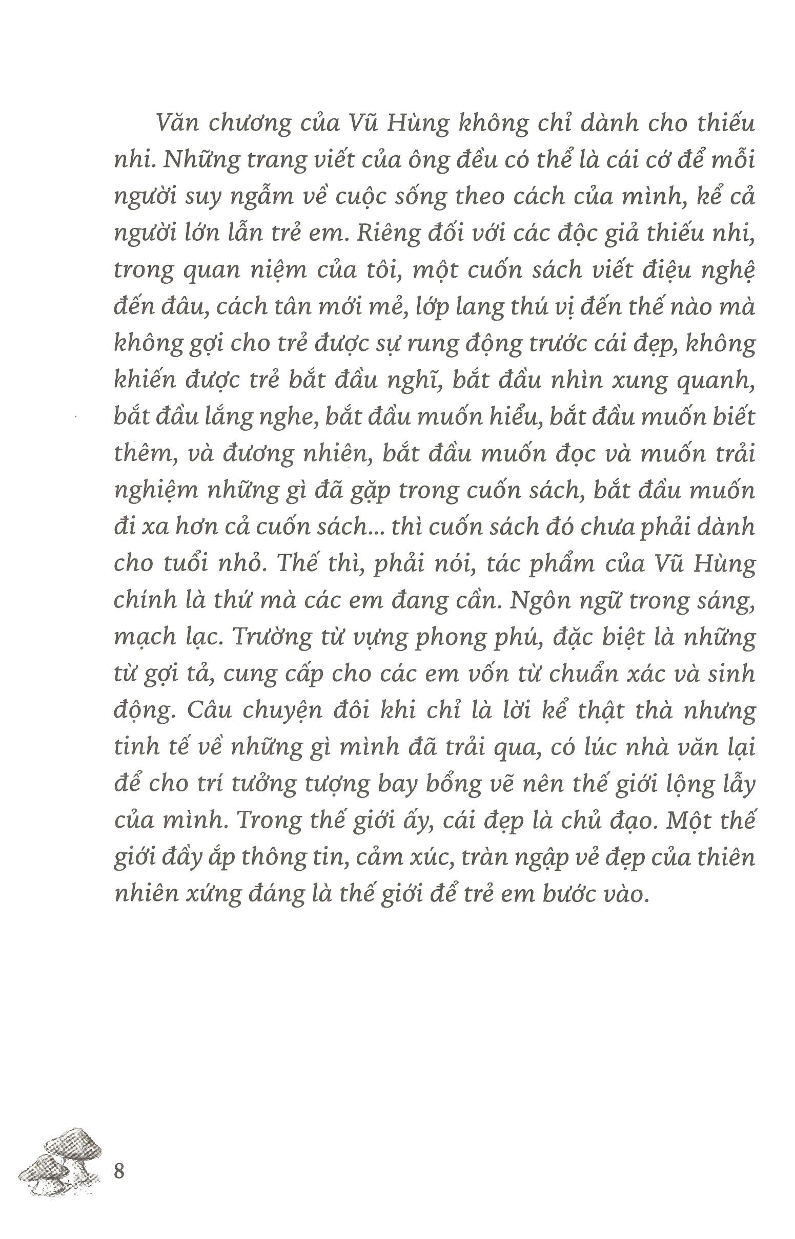 “Đọc Vũ Hùng, tôi thường phải dừng lại giữa chừng để lắng nghe niềm hân hoan đang dâng lên trong lòng, niềm hân hoan như hạt mầm được gieo, lớn dần lên cùng từng câu chữ, từng đoạn, từng áng văn thấm đẫm gió ngàn, hơi mưa, hơi đất và những âm thanh kì diệu của tự nhiên. Vũ Hùng đưa thiên nhiên về với người đọc cứ nhẹ nhõm, tỉ mẩn, nhẩn nha, và đầy âu yếm, đến độ thiên nhiên trở nên quen thuộc với tất cả vẻ đẹp kì vĩ của nó, như thể ta vẫn từng sống trong một căn nhà ấy, mà mỗi ngày, cùng nhà văn, ta phát hiện ra những góc đẹp nao lòng.” (TS Giáo dục học Nguyễn Thụy Anh)