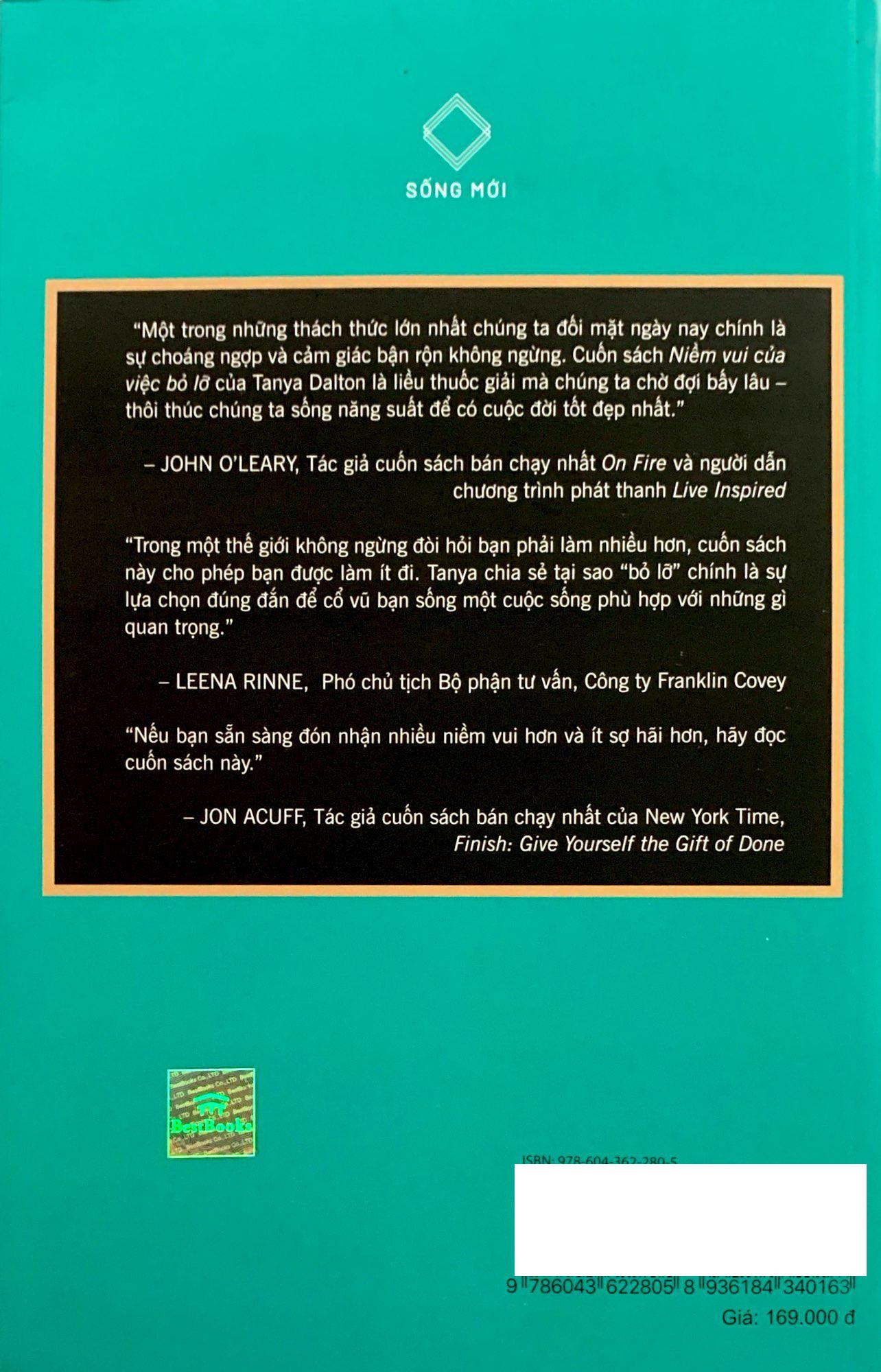 Sống năng suất không có nghĩa là làm nhiều hơn. Sống năng suất là làm những điều quan trọng nhất. Bạn có thể định nghĩa được khái niệm “đủ” trong cuộc sống của mình? Những cuốn sách về hạnh phúc, về cân bằng cuộc sống hay tối giản tâm trí – của cải đã không còn xa lạ với chúng ta. Nhưng NIỀM VUI CỦA VIỆC BỎ LỠ mang đến cho chúng ta một góc nhìn hoàn toàn mới: đánh giá lại cuộc sống trong mỗi ngày của mình để hiểu được chúng ta đã và đang hối tiếc điều gì, đâu mới là năng suất thực sự của bản thân. Thời gian là hữu hạn và mong muốn của chúng ta là vô hạn. Vậy làm như thế nào để cân bằng giữa thời gian và mong muốn? Phương pháp liveWELL Method của tác giả Tanya Dalton sẽ giúp bạn có câu trả lời, để những tính từ “bận rộn”, “choáng ngợp” không còn dùng để miêu tả mỗi ngày của bạn nữa, để bạn hiểu như thế nào là “đủ”. Từng chương sách trong NIỀM VUI CỦA VIỆC BỎ LỠ như một cách cửa sổ giúp chúng ta đón nhận những tia nắng sớm mai rực rỡ soi chiếu tâm hồn và để gió cuốn đi những suy nghĩ tiêu cực, những bộn bề lo toan không cần thiết. Một cuốn sách hay có lẽ chỉ cần có vậy.