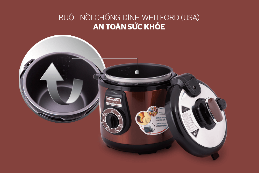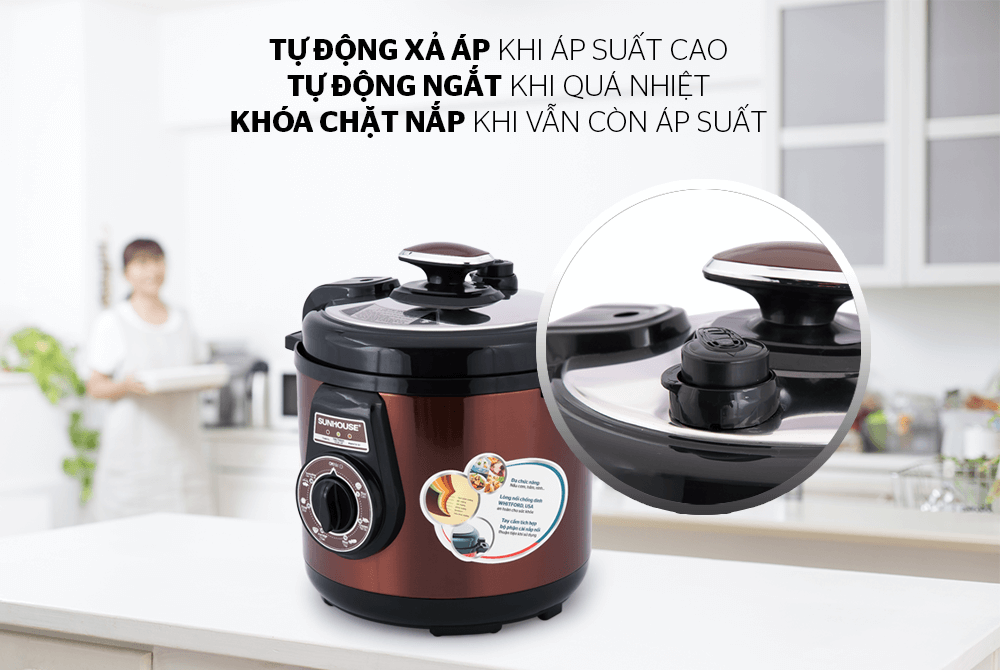 - Có thiết bị bảo vệ giới hạn nhiệt độ, nồi sẽ tự động ngắt điện khi nồi đang được đun trong trạng thái rỗng không hoặc không có miếng đệm vung nồi bên trong Đa chức năng nấu Bạn có thể dùng nồi để nấu cơm, nấu canh, nấu cháo, nấu súp hoặc đun nước theo chế độ hẹn giờ để tiết kiệm thời gian chuẩn bị, không phải đứng bếp quá lâu. Có chức năng hẹn 24 giờ Nồi Áp Suất Điện Đa Năng Sunhouse trang bị chức năng hẹn giờ lên đến 24 tiếng, tạo điều kiện thuận lợi để bạn rảnh tay làm những công việc khác trong lúc chờ đợi thực phẩm chín. Điều khiển bằng chip điện tử Nồi Áp Suất Điện Tử Đa Năng Sunhouse điều khiển bằng chip điện tự thông minh, hệ thống sẽ vận hành theo những chương trình đã được cài đặt sẵn giúp tiết kiệm thời gian cho bạn. Bên cạnh đó, sản phẩm còn trang bị bảng điều khiển bằng tiếng Việt tạo sự thuận lợi khi sử dụng. Dung tích lớn Nồi Áp Suất Điện Đa Năng Sunhouse có dung tích 6 lít rộng rãi cho bạn thoải mái chế biến các món cơm, canh, soup, hầm,… chiêu đãi gia đình và bạn bè. Nút điều chỉnh bằng tiếng Việt dễ dùng Nồi Áp Suất Điện Đa Năng Sunhouse sử dụng bảng điều khiển dạng nút vặn có hướng dẫn sử dụng bằng tiếng Việt, giúp bạn dễ dàng thao tác và sử dụng nhanh chóng ngay từ lần đầu tiên. Không làm mất dinh dưỡng của thực phẩm Nồi Áp Suất Điện Đa Năng Sunhouse giúp nấu kín hoàn toàn nên bạn có thể đặt thời gian nấu dưới áp suất theo các loại thức ăn khác nhau để tránh việc mất chất dinh dưỡng của các thực phẩm có hàm lượng dinh dưỡng cao đồng thời giúp thực phẩm được mềm và ngon hơn. Công suất lớn, nấu ăn nhanh Nồi Áp Suất Điện Đa Năng Sunhouse được cài đặt chế độ nấu nhanh, dựa trên công nghệ áp suất điện, bạn có thể hầm xương giò chỉ trong vòng 15 phút mà vẫn giữ được hương vị của thực phẩm. Công suất lên đến 900W giúp nấu thức ăn chín nhanh, rút ngắn giai đoạn chuẩn bị những món hầm, ninh. Tiết kiệm thời gian và điện năng Nồi Áp Suất Điện Đa Năng Sunhouse có khả năng giữ nhiệt độ ổn định với hiệu quả giữ ấm hơn 80% và tiết kiệm tới 30% điện năng so với nồi điện thông thường nên bạn có thể yên tâm sử dụng. Hướng dẫn sử dụng