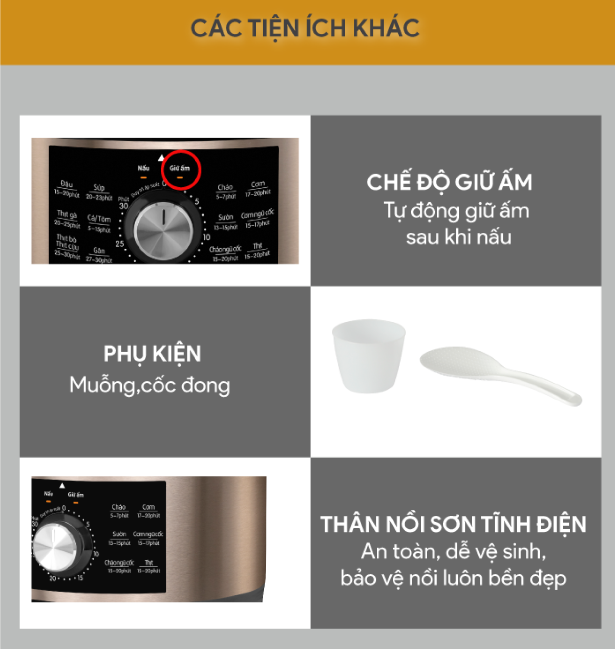 - Chức năng giữ ấm tự động sau khi kết thúc nấu.