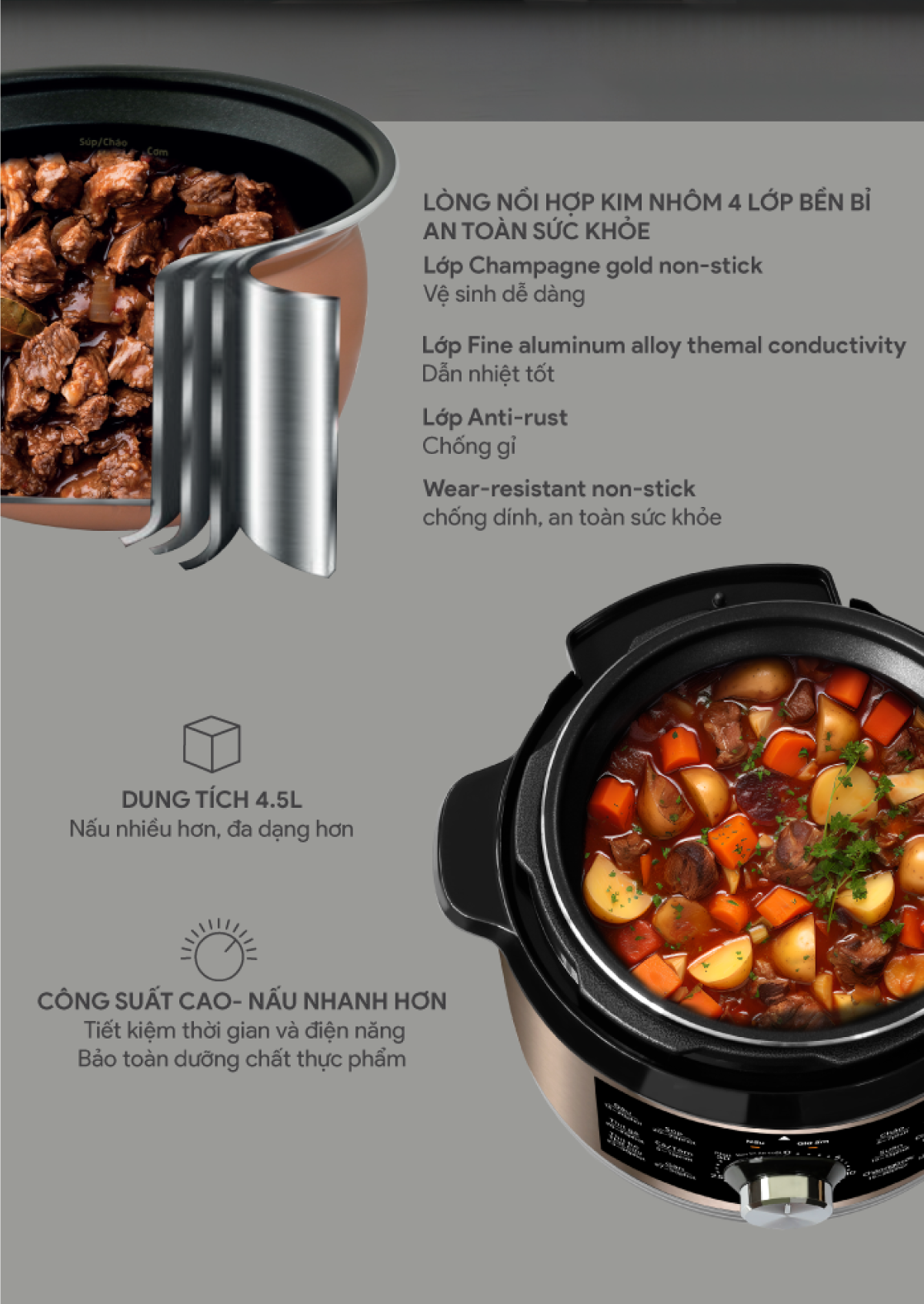 Sản phẩm kết hợp giữa nồi áp suất, bếp điện và nồi om. Điểm đặc biệt của nồi là hệ thống lập trình kiểm soát nhiệt độ và áp suất. Nồi được thiết kế hiện