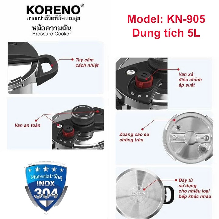 ✨Nồi áp suất Inox 5L Koreno nấu bếp từ bếp ga thiết kế 3 van an toàn bảo hành 12 tháng
