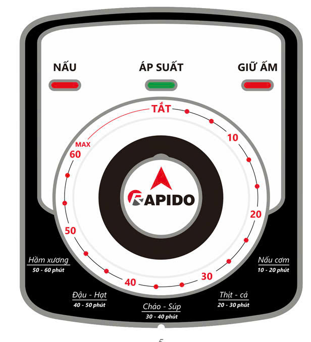 Nồi áp suất đa năng Rapido RPC 900M là một dụng cụ nhà bếp đa năng được phát triển bằng cách sử dụng công nghệ mới nhất. Sản phẩm kết hợp giữa nồi áp suất, bếp điện và nồi om. Điểm đặc biệt của nồi là hệ thống lập trình kiểm soát nhiệt độ và áp suất. Nồi được thiết kế hiện đại, sang trọng, đáng tin cậy, an toàn khi hoạt động và tiết kiệm năng lượng. Đây là công cụ nấu ăn lý tưởng cho gia đình và là một sự thay thế hoàn hảo cho nồi áp suất thông thường. – Kết hợp chức năng của nấu, hầm và om. – Hiệu suất nhiệt cao, tiết kiệm năng lượng và thời gian. Nhanh hơn và hiệu quả hơn nồi cơm điện. – Quy trình nấu kín giúp thực phẩm giữ lại dinh dưỡng và thơm ngon hơn. – Lòng nồi bằng inox 304 dễ lau chùi, an toàn cho sức khỏe. – Các chức năng an toàn tích hợp: Nồi không thể tăng áp suất khi nắp không được đậy kín và không thể mở nắp khi áp suất bên trong cao hơn 4kPa. Khi nhiệt độ và áp suất bên trong vượt quá ngưỡng cho phép, van sẽ xả áp. Khi thiết bị giới hạn áp suất bên trong nồi bị hỏng và áp suất bị vượt quá giới hạn, nồi sẽ tự động xả áp từ khe hở giữa nắp và thân nồi Chức năng bảo vệ khi quá nhiệt: nồi sẽ tự động ngắt khi nhiệt độ bên trong vượt quá giới hạn cho phép. CHẾ ĐỘ NẤU ÁP SUẤT Gạo lứt – Cơm: Thời gian nấu là 17 -20 phút Nấu thịt cá: Thời gian nấu là 18 – 25 phút Nấu cháo Súp: Thời gian nấu 30 – 40 phút Đậu: Gồm các loại hạt, thời gian nấu 30 – 40 phút Hầm: Xương hoặc gân, thời gian nấu 75 – 90 phút Có thể điều chỉnh tăng giảm thời gian trong khoảng tối đa là 60 phút bằng cách điều khiển núm điều chỉnh.