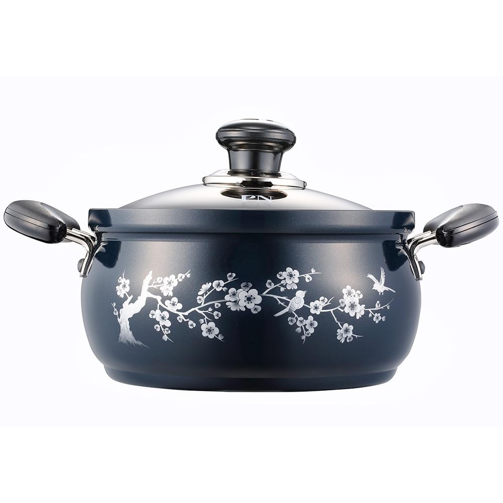 Nồi nhà bếp (loại nồi Casserole size trung) nhôm thuần khiết cao cấp hiệu PoongNyun Series Fosya Mei IH dầy 2.5mm chống dính, chống trầy xước màu xanh đen họa tiết hoa mai với công nghệ tráng men hiện đại “Hard Anodizing” không tróc men, chống gỉ sét, chống ăn mòn, giữ và gia nhiệt lâu hơn giúp thức ăn mau chín tiết kiệm thời gian và nhiên liệu, thiết kế nắp kiếng chịu nhiệt chống trào, 2 tay cầm chống nóng, sử dụng trên bếp gas, bếp hồng ngoại, bếp từ, gồm 02 món (1 nồi và 1 nắp kiếng chịu nhiệt 20cm).