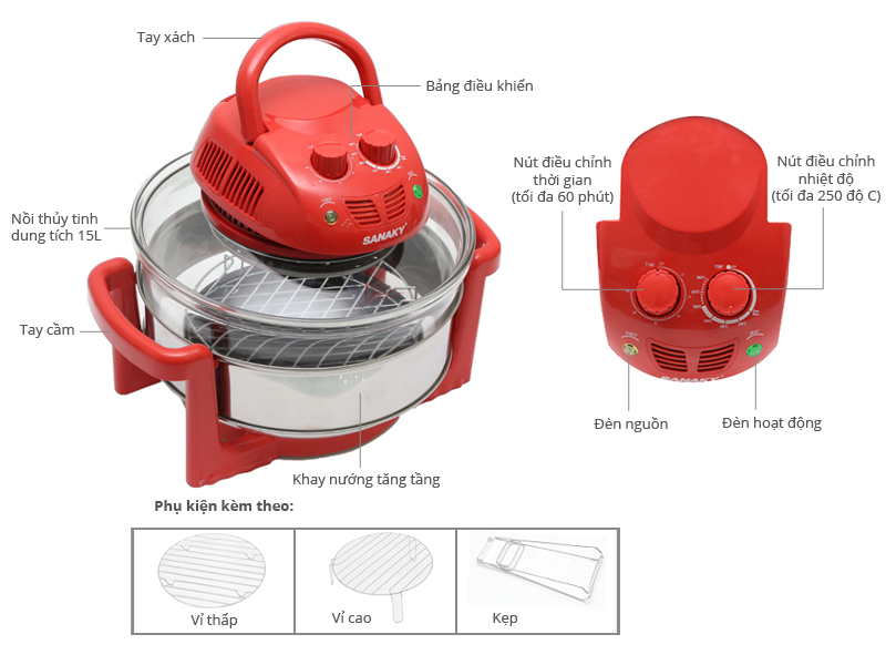 - Kiểu dáng hiện đại, gọn nhẹ, dễ vệ sinh Điện áp 220V/50Hz Kích thước (mm) 420x 380 x 350 Trọng lượng (kg) 7.3 Xuất xứ Chính hãng Nồi nướng thủy tinh Sanaky VH-188T/D Nồi nướng thủy tinh Sanaky VH-188T/D là sản phẩm trong dòng sản phẩm nồi nướng thủy tinh của Sanaky, đây là loại nồi nướng đa năng đốt nóng bằng đền halogen. Với dung tích 15 lít, hai màu trang nhã Trắng và Đỏ. Nồi nướng VH-188T/D là sự lựa chọn của nhiều bà nội trợ cho gian bếp của gia đình. Nồi nướng thủy tinh Sanaky VH-188D màu đỏ bắt mắt Nồi nướng thủy tinh Sanaky VH-188T màu trắng trang nhã Đặc điểm chung của nồi nướng thủy tinh Sanaky VH-188T/D - Có bộ hẹn giờ, điều chỉnh nhiệt độ: với nút điều chỉnh thời gian nhiệt độ trên nóc nồi khách hàng có thể dễ dàng điều chỉnh nhiệt độ từ 65 - 250℃ phù hợp với từng loại thực phẩm. Nhờ tính năng hẹn giờ từ 0 - 60 phút các bà nội trợ có thể vừa nướng vừa làm các công việc khác mà không lo thực phẩm bị cháy xém trong nồi. - Thân nồi bằng thủy tinh chịu nhiệt: Với dung tích 15 lít, thân nồi nướng thủy tinh Sanaky VH-188T/D được đúc hoàn toàn bằng thủy tinh chịu nhiệt, dày giúp chịu được nhiệt độ cao an toàn cho người sử dụng. - Làm nóng bằng đèn halogen kết hợp với quạt đối lưu: nồi được trang bị hệ thống làm nóng bằng đèn halogen đặt trên nắp nồi. Kết hợp với quạt đối lưu giúp hơi nóng lan đều khắp nồi giúp thực phẩm chín nhanh, vàng đều và vẫn giữ được nước bên trong. - Chân đế bằng nhựa cao cấp: Chân đế của nồi nướng thủy tinh Sanaky VH-188T/D được làm bằng nhựa cao cấp, chịu lực, chịu nhiệt tốt, giúp nâng đỡ nồi chắc chắn, an toàn. - Có vành đai tăng thể tích: khi các bà nội trợ muốn nướng, quay nhiều thực phẩm một lúc như gà, vịt nguyên con có thể sử dụng đai tăng thể tích. Đai tăng thể tích có thể làm không gian nướng cao lên 10 cm giúp nướng được nhiều thực phẩm hơn. - Có giá đỡ cao và giá đỡ thấp: với hai giá để thực phẩm người sử dụng có thể tùy chọn cho phù hợp với lượng thực phẩm chế biến. Mỗi nồi đều được trang bị kẹp thực phẩm và khay hứng mỡ thừa dễ dàng sử dụng. Nồi nướng thủy tinh Sanaky VH-188D có thân nồi bằng thủy tinh chịu nhiệt bền bỉ Nồi nướng thủy tinh VH-188T có đai tăng thể tích Tính năng nổi bật của nồi nướng thủy tinh Sanaky VH-188T/D - Nhiều chức năng nấu nướng: Nồi nướng VH-188T/D được sản xuất theo công nghệ Nhật Bản, ngoài chức năng nướng các bà nội trợ còn có thể sử dụng nồi để làm các món quay, rô ti, rang, làm bánh pizza,... - Tiết kiệm chi phí: với việc làm nóng thực phầm hoàn toàn trong lòng nồi giúp giảm đáng kể lượng nhiệt bị khuếch tán ra môi trường từ đó giảm điện năng tiêu thụ. Ngoài ra nồi nướng thủy tinh Sanaky VH-188T/D không sử dụng thêm dầu mỡ trong quá trình nướng giảm chi phí đáng kể cho các bà nội trợ. - Rã đông thực phẩm: với nồi nướng đa năng bạn có thể rã đông các thực phẩm để trong tủ lạnh giúp tiết kiệm thời gian chế biến. - Dễ dàng vệ sinh: nồi nướng thủy tinh Sanaky VH-188T/D được làm hoàn toàn bằng thủy tinh chịu nhiệt nên các bà nội trợ có thể quan sát quá trình chín của thực phẩm trong nồi. Sau khi sử dụng xong các chị em có thể dễ dàng vệ sinh cả trong lẫn ngoài để dùng cho lần sau. Nồi nướng thủy tinh VH-188D điều khiển bằng núm cơ xoay tiện dụng Nồi nướng thủy tinh VH-188T có nhiều chức năng nướng Chức năng bảo vệ của nồi nướng thủy tinh Sanaky VH-188T/D - Chức năng ngắt điện tự động: nếu người sử dụng tự động mở nắp khi nồi đang hoạt động nồi sẽ tự động ngắt điện nên rất an toàn. - Có giá bê an toàn: nồi nướng thủy tinh Sanaky VH-188T/D có giã đỡ bằng nhựa rất chắc chắn nên các bà nội trợ có thể dễ dàng bưng bê nồi. - An toàn cho sức khỏe: với việc nướng bằng nồi nướng đa năng mỡ trong thực phẩm sẽ bị chảy ra ngoài. Bạn sẽ không phải thưởng thức những món ăn đầy dầu mỡ. Ngoài ra với việc nướng bằng nồi thực phẩm sẽ không bị ám khói gây hại cho sức khỏe như nướng bằng các phương pháp truyền thống. Và điểm đặc biệt nữa là nồi nướng không phát ra sóng điện từ ảnh hưởng đến môi trường và người sử dụng. Nồi nướng thủy tinh VH-188T/D an toàn cho người sử dụng Lưu ý khi sử dụng nồi nướng thủy tinh Sanaky VH-188T/D - Đọc kỹ hướng dẫn sử dụng trước khi dùng. - Đặt nắp lên nồi trước khi cắm điện - Không sờ vào bề mặt nồi khi nhiệt độ vẫn còn cao. - Để tránh bị điện giật không nên để dây điện, phích cắm bị ẩm, thấm vào nước. - Đặt nồi xa tầm tay trẻ em. - Tháo phích cắm khi không sử dụng nữa hoặc trước khi tiến hành lau chùi, cọ rửa - Không nên vệ sinh khi nồi đang còn nóng cần để nồi hạ nhiệt khoảng 10 phút. - Để nồi xa các vật dụng khác đặc biệt là các vật dụng nóng.