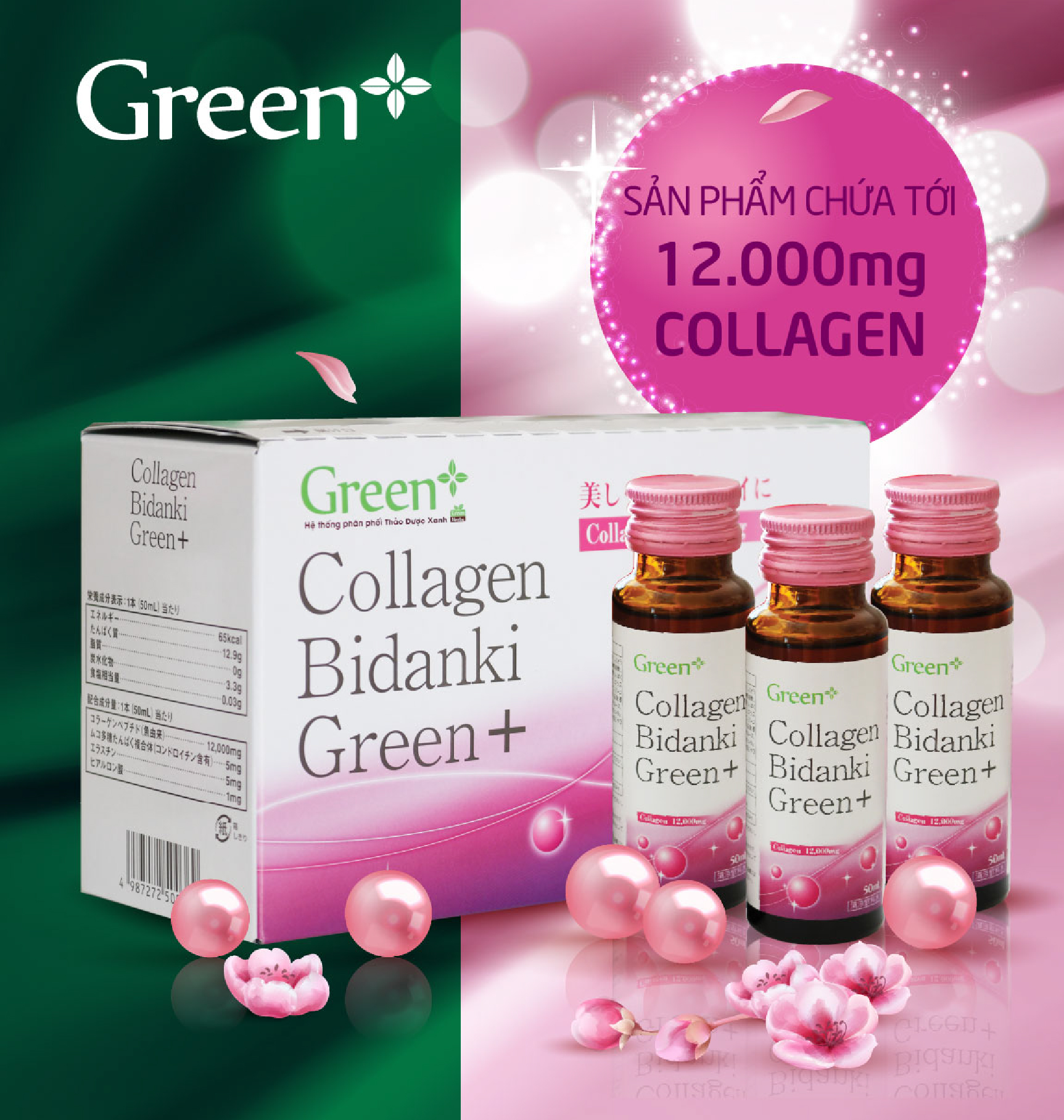 - Ngoài ra, chị em phụ nữ có thể tham khảo ý kiến chuyên gia khi cần thiết để đạt hiệu quả tối đa trong quá trình sử dụng collagen nước. Bảo quản: Nơi thoáng mát, tránh nơi có nhiệt độ cao và độ ẩm cao, tránh ánh sáng mặt trời chiếu trực tiếp. Chú ý: Thực phẩm này không phải là thuốc và không có tác dụng thay thế thuốc chữa bệnh. Không dùng cho người có mẫn cảm với bất kỳ thành phần nào của sản phẩm. Khối lượng tịnh: 50ml/ chai (± 7.5%) Xuất xứ: Nhật Bản Số ĐKSP: 5402/2018/ĐKSP. Công ty sản xuất: Yonedakeiteisya Co., Ltd Thương nhân nhập khẩu, phân phối và chịu trách nhiệm về chất lượng sản phẩm: CÔNG TY CỔ PHẦN TẬP ĐOÀN GREEN+ Video Lễ ra mắt sản phẩm Nước uống Collagen Bidanki Green+: Ngày 17/09/2022, Green+ vinh dự nhận Huy chương “Sản phẩm vàng vì sức khỏe cộng đồng năm 2022” do Hiệp hội Thực phẩm chức năng Việt Nam (VAFF) trao tặng. Giải thưởng “Sản phẩm vàng vì sức khỏe cộng đồng” là giải thưởng uy tín do Hiệp hội Thực phẩm chức năng Việt Nam tổ chức mỗi năm nhằm tôn vinh các sản phẩm bảo vệ sức khỏe và thực phẩm chức năng tốt, an toàn, hiệu quả được người tiêu dùng tín nhiệm. Giải thưởng “Sản phẩm vàng vì sức khỏe cộng đồng” đã được tổ chức 10 lần rất thành công; nhận được sự quan tâm của các doanh nghiệp sản xuất phân phối TPCN và người tiêu dùng trong cả nước. Từ đó khuyến khích các doanh nghiệp không ngừng nỗ lực để đưa ra các sản phẩm chăm sóc sức khỏe tốt nhất cho người dân Việt Nam. Người tiêu dùng Việt Nam cũng xem giải thưởng như một căn cứ để tìm kiếm & lựa chọn sản phẩm chăm sóc sức khỏe. Green+ rất vinh dự khi đạt giải “Sản phẩm vàng vì sức khỏe cộng đồng năm 2022” cho sản phẩm: Collagen Bidanki Green+ : Cung cấp tới 12.000mg collagen peptites mỗi ngày, giúp tái tạo và trẻ hóa làn da.
