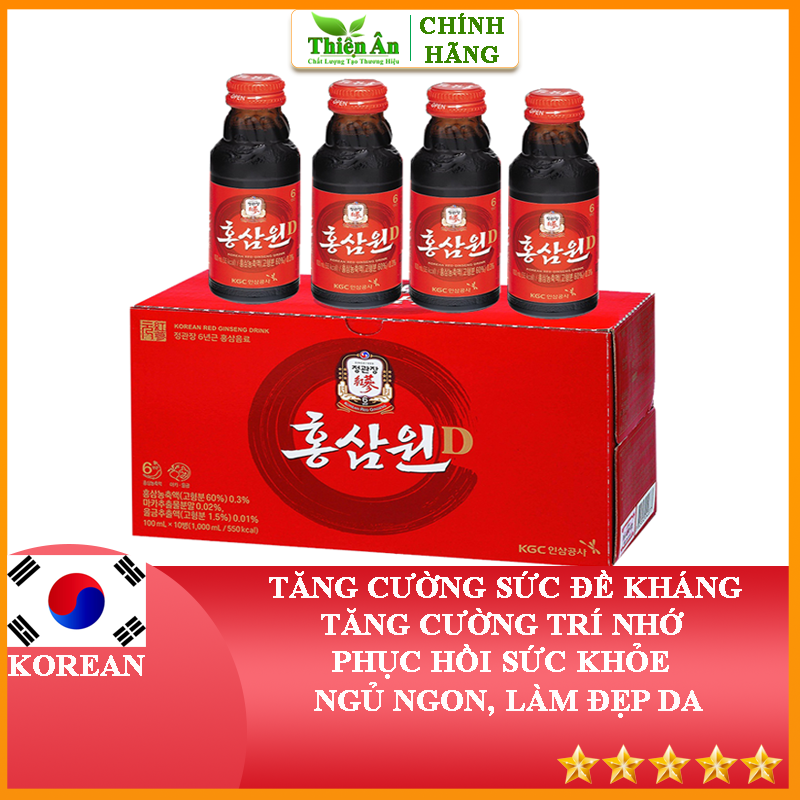 Mua tại TiktokNước Uống Tăng Lực Hồng Sâm Won KGC Cheong Kwan Jang 100ml x 10 Chai (Chú Ý: Sản phẩm có thể thay đổi một ít chi tiết trên mẫu mã mới tùy theo nhà sản xuất) THÀNH PHẦN: Tinh chất hồng sâm 6 năm tuổi, thêm các thành phần như linh chi, táo và thảo dược CÔNG DỤNG: Phù hợp cho mọi lứa tuổi và giới tính, nhất là những người mệt mỏi, suy nhược, người có sức khỏe kém, người mới ốm dậy. Người lao động trí óc căng thẳng, người cần tăng cường sức đề kháng cho cơ thể. Người già yếu HƯỚNG DẪN SỬ DỤNG: Ngày uống 1 chai vào sáng hoặc chiều. Uống ngon hơn khi để lạnh, vừa giúp giải nhiệt và lấy lại sức khỏe cho cơ thể. Lưu ý: Để ý và xem xét kỹ ngày sản xuất, hạn sử dụng được in trên bao bì của sản phẩm