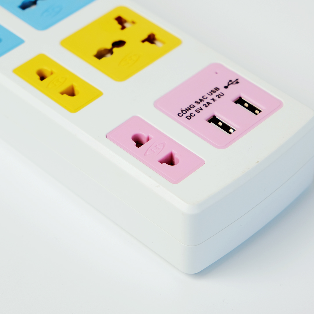 Ổ cắm 3 ổ đa năng + 2 ổ cắm USB cách điện bền đẹp - Chịu nhiệt, chống cháy: 750 độ C - Chiều dài dây điện: 1.8 mét - Chân tiếp xúc với