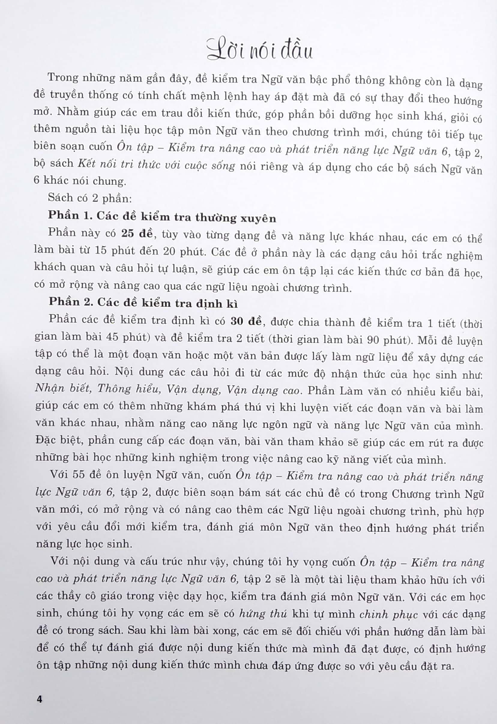 Trong những năm gần đây, đề kiểm tra Ngữ văn bậc phổ thông không còn là dạng đề truyền thống có tính chất mệnh lệnh hay áp đặt mà đã có sự thay đổi theo hướng mở. Nhằm giúp các em trau dồi kiến thức, góp phần bồi dưỡng học sinh khá, giỏi có thêm nguồn tài liệu học tập môn Ngữ văn theo chương trình mới, chúng tôi tiếp tục biên soạn cuốn Ôn tập - Kiểm tra nâng cao và phát triển năng lực Ngữ văn 6, tập 2, bộ sách Kết nối tri thức với cuộc sống nói riêng và áp dụng cho các bộ sách Ngữ văn 6 khác nói chung.