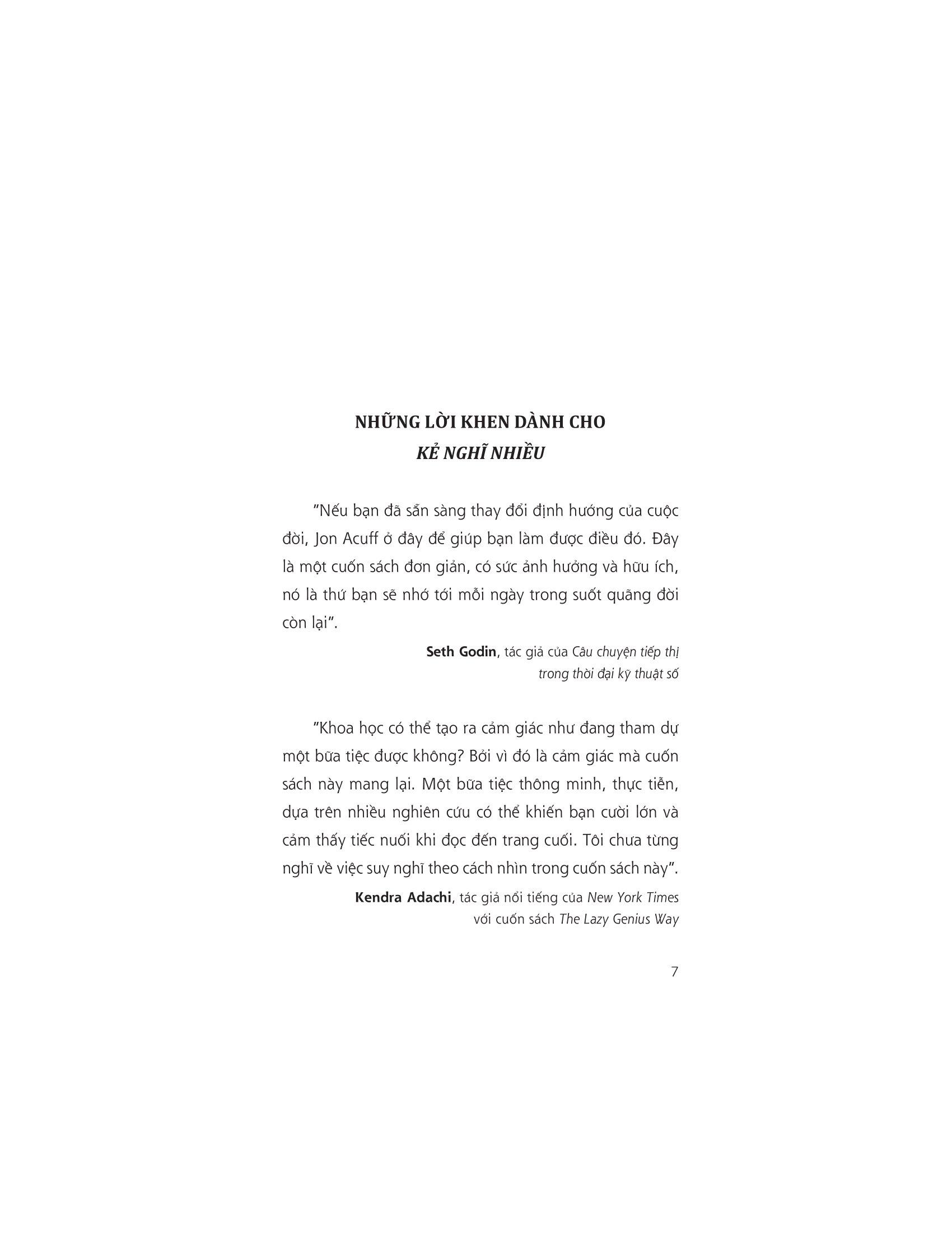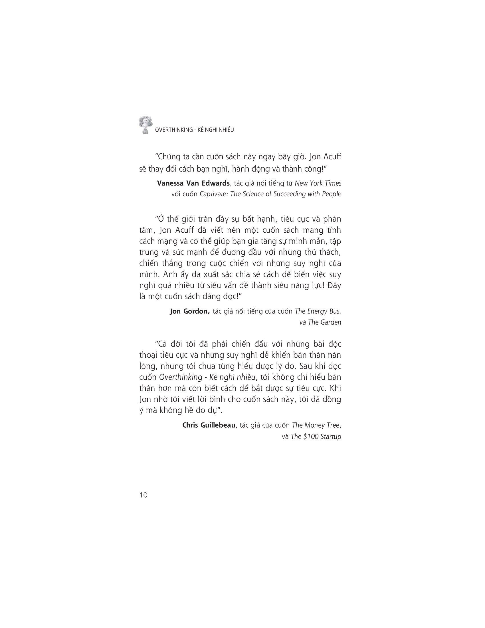 “Tôi không thể đếm hết số lần từng nói với các nhà lãnh đạo, ‘Anh đang suy nghĩ quá nhiều cho một quyết định’. Nó là kẻ thù tự nhiên của sự tập trung, và tôi rất mừng vì Jon Acuff đã không ngại gian khổ, nỗ lực hết m.ình để tìm ra cái nhìn mới về một chủ đề quan trọng như thế này”.