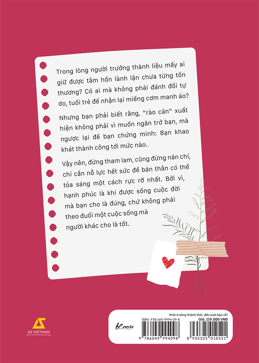Phải trưởng thành thôi, đến lượt bạn rồi! Trong lòng người trưởng thành liệu mấy ai giữ được tâm hồn lành lặn chưa từng tổn thương? Có ai mà không phải đánh đổi tự do, tuổi trẻ để nhận lại miếng cơm manh áo? Nhưng bạn phải biết rằng, “rào cản” xuất hiện không phải vì muốn ngăn trở bạn, mà ngược lại để bạn chứng minh: Bạn khao khát thành công tới mức nào.