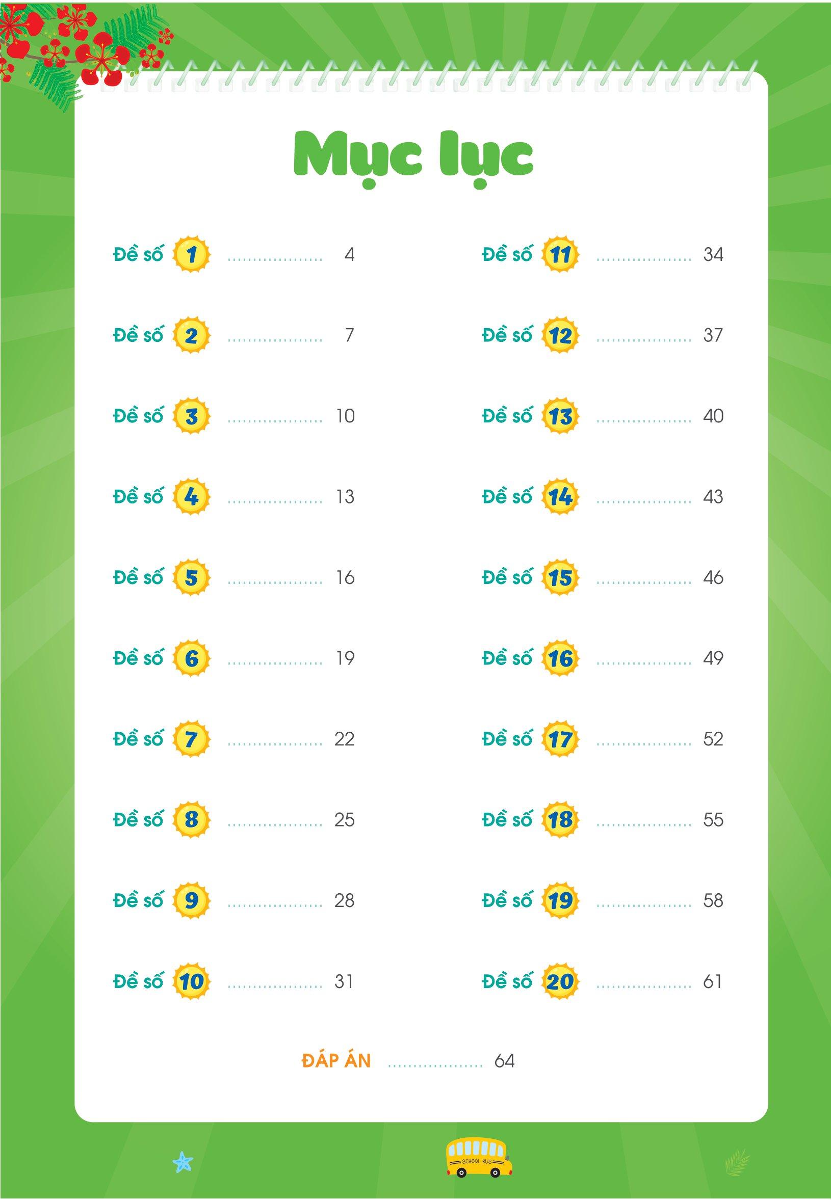Cuốn sách bao gồm 20 bộ đề, mỗi bộ đề gồm 2 phần Phần đọc và Phần viết. Điều này giúp các em thực hành và nắm vững kiến thức thông qua các dạng bài tập khác nhau. Sự đa dạng này cũng giúp rèn luyện khả năng tư duy, suy luận và kích thích trí tưởng tượng của các em nhỏ. Phần viết của cuốn sách cũng giúp các con luyện chính tả, phân biệt được các chữ cái, từ, các vần dễ bị nhầm lẫn thường gặp