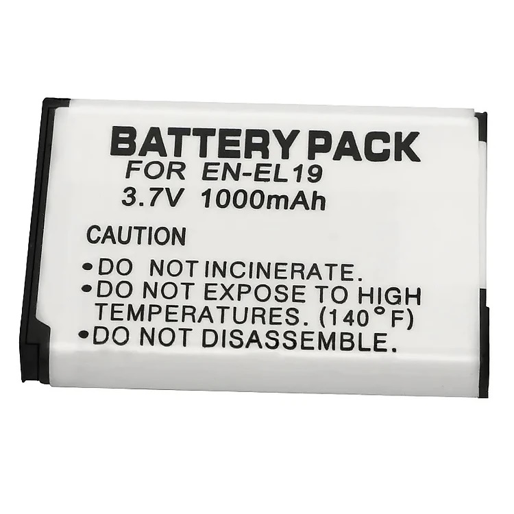 Kiểu Pin tiêu chuẩn, Li-Ion, Pin sạc Sản phẩm: EN-EL19 Vôn: 3.7V Dung tích: 1000mAh Tiêu chuẩn CE Thời gian làm việc: hơn 300 lần Sử dụng: Máy ảnh Các mẫu pin tương thích cho