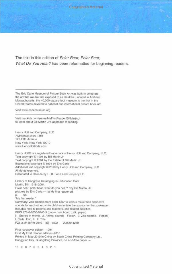 These beloved children's stories are now available in beginning reader format. With the important pre-reading concepts of rhyme, rhythm, and repetition, these picture books have long been used as beginning readers. Now, with a 6" x 9" trim and a classic beginning reader layout, children will have a more "grown up" version to read by themselves. Complete with an introduction by master educator Laura Robb, and with fun reading activities added, these new versions of Brown Bear, Brown Bear, What Do You See? and Polar Bear, Polar Bear, What Do You Hear? are certain to appeal to a new age group and find an even wider audience.