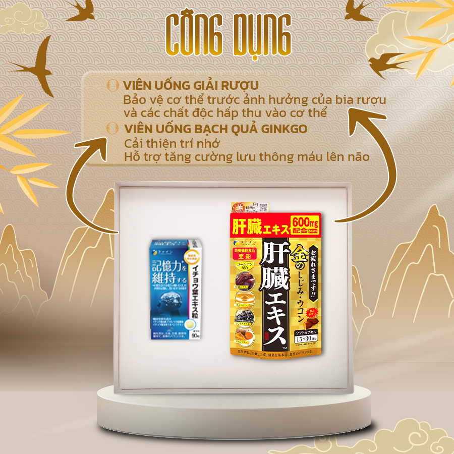 Combo FUJI Tết An Khang - Viên uống giải rượu Fine Japan tăng cường chức năng gan 90 viên - Viên Uống Bạch Quả Ginkgo Fine Japan Hỗ Trợ Chức Năng Não Hộp 18g (90