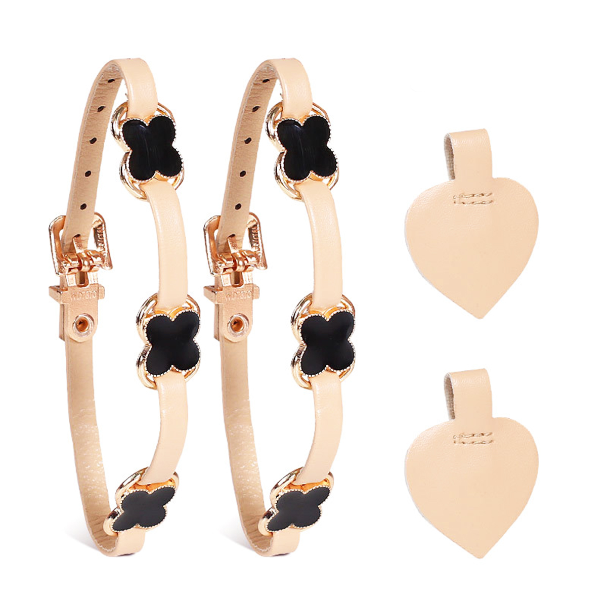Giày cao gót từ 1 tấc trở lên nhìn rất quyến rũ nhưng mang vào cất bước là tuột gót Chân lỡ size mua giày rộng tí là tuột chân Gót giày nhọn mảnh khảnh vừa bước chân đã trật ngay mắt cá chân Giày búp bê đế bằng thường tuột gót CÔNG DỤNG NỔI BẬT Thiết kế quai giày đính phụ kiện cỏ bốn lá xinh xắn, hiện đại ôm sát chân giúp giữ giày không bị tuột khỏi chân khi bàn chân nhấc lên cất bước, đồng thời cổ chân cũng được cố định vào giày giúp không bị lật, trật mắt cá chân Miếng dán không đường may chắc chắn, kết hợp phần keo 3M bền bỉ phía sau giúp cố định vào giày Chất liệu da PU dày dặn và bền đẹp, hài hòa với hầu hết giày chất liệu da. Móc khoen inox dễ tháo dễ cài, dây giày có bấm sẵn nút lỗ giúp dễ dàng điều chỉnh kích thước. Phù hợp với hầu hết các kiểu giày búp bê, cao gót, NGỮ CẢNH SỬ DỤNG Giày bị tuột gót Giày cao gót khó đi lại Giày rộng size THÔNG TIN SẢN PHẨM Kích thước: đoạn dây vòng qua cổ chân dài 27,5cm; dùng được cho các size giày nữ 34 - 35 - 36 - 37 - 38 - 39 - 40. Chất liệu: + Khoen, khóa và móc khóa bằng inox. + Quai giày bằng da PU có độ đàn hồi cao, bền đẹp và mềm mại cho da. Màu sắc: màu kem, đen HƯỚNG DẪN SỬ DỤNG