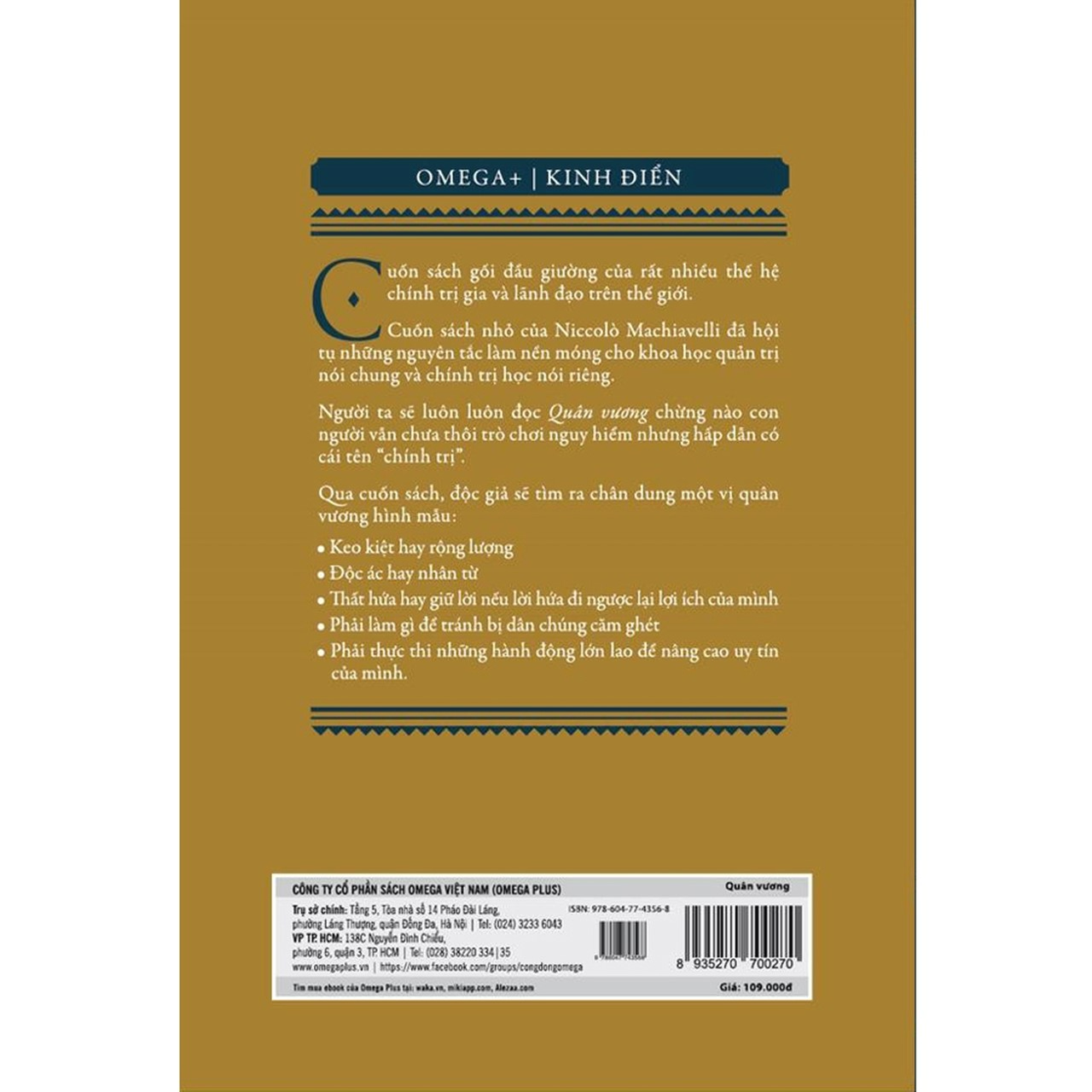 Mua tại TiktokCUỐN SÁCH GỐI ĐẦU GIƯỜNG CỦA RẤT NHIỀU THẾ HỆ CHÍNH TRỊ GIA VÀ LÃNH ĐẠO TRÊN THẾ GIỚI. Chỉ trong một cuốn sách nhỏ của Machiavelli đã hội tụ những nguyên tắc làm nền móng cho khoa học quản trị nói chung và chính trị học nói riêng. Người ta sẽ luôn luôn đọc Quân vương chừng nào con người vẫn chưa thôi trò chơi nguy hiểm nhưng hấp dẫn có cái tên “chính trị”.Qua cuốn sách, độc giả sẽ tìm ra chân dung một vị quân vương hình mẫu: • Keo kiệt hay rộng lượng • Độc ác hay nhân từ • Thất hứa hay giữ lời nếu lời hứa đi ngược lại lợi ích của mình • Phải làm gì để tránh bị dân chúng căm ghét • Phải thực thi những hành động lớn lao để nâng cao uy tín của mình .