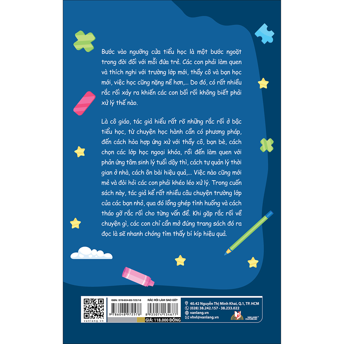 Là cô giáo, tác giả hiểu rất rõ những rắc rối ở bậc tiểu học, từ chuyện học hành cần có phương pháp, đến cách hòa hợp ứng xử với thầy cô, bạn bè, cách chọn các lớp học ngoại khóa, rồi đến làm quen với phản ứng tâm sinh lý tuổi dậy thì, cách tự quản lý thời gian ở nhà, cách ôn bài hiệu quả, Việc nào cũng mới mẻ và đòi hỏi các con phải khéo léo xử lý. Trong cuốn sách này, tác giả kể rất nhiều câu chuyện trường lớp của các bạn nhỏ, qua đó lồng ghép tình huống và cách tháo gỡ rắc rối cho từng vấn đề. Khi gặp rắc rối về chuyện gì, các con chỉ cần mở đúng trang sách đó ra đọc là sẽ nhanh chóng tìm thấy bí kíp hiệu quả.