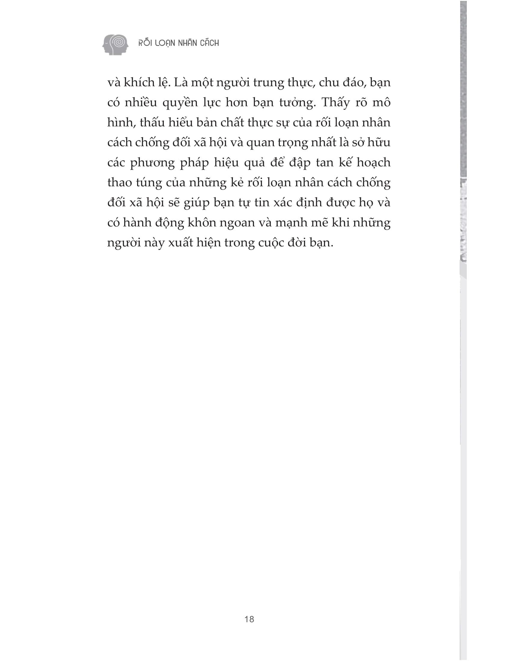 Cuốn sách Rối loạn nhân cách sẽ giúp bạn nhận diện bản chất, vạch trần cạm bẫy và có hành động khôn ngoan khi đương đầu với những kẻ thao túng vô lương tâm. Bên cạnh đó, cuốn sách hướng dẫn bạn các công cụ để bảo vệ bản thân trước những kẻ rối loạn nhân cách chống đối xã hội.