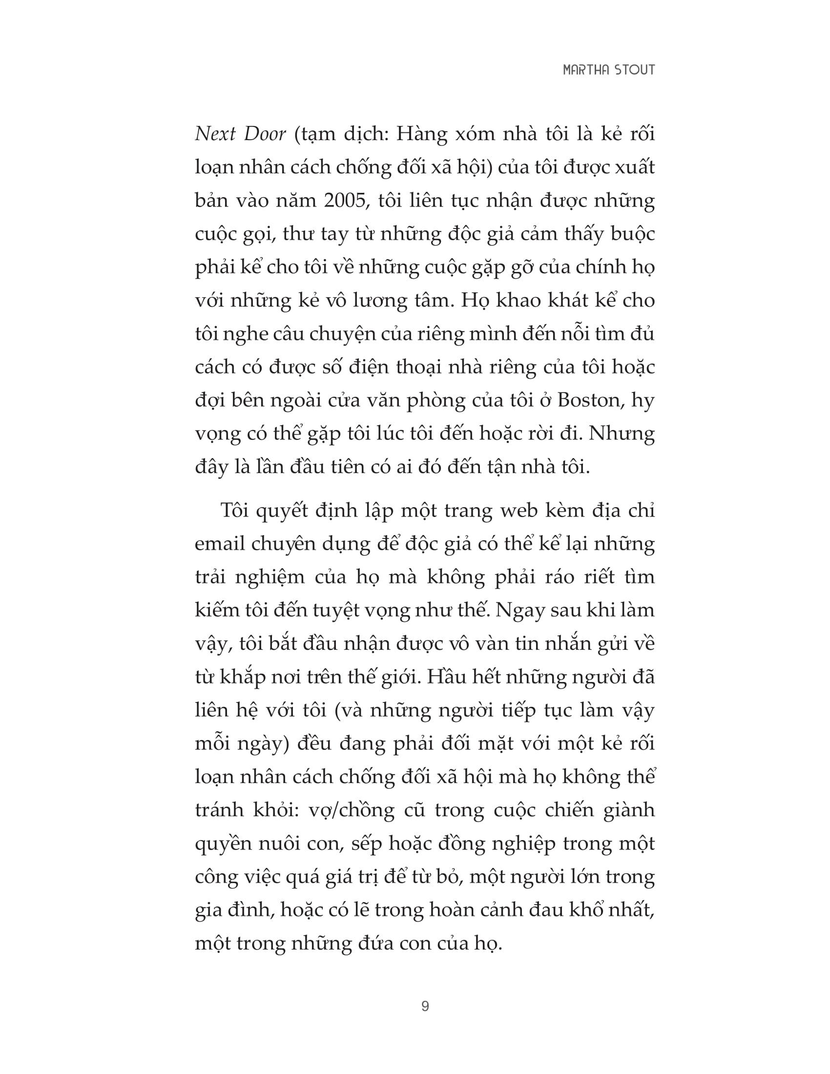 Martha Stout, Ph.D. Giảng viên tâm lý học của khoa Tâm thần học tại Trường Y Harvard trong 25 năm, cộng sự lâm sàng tại Bệnh viện Đa khoa Massachusetts ở Boston. Là tác giả của nhiều cuốn sách như The Sociopath Next Door, The Paranoia Switch, The Myth of Sanity.