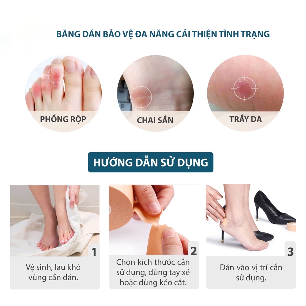 Đóng gói: 1 cuộn miếng dán bảo vệ chân 2cm x 100cm (dùng được 10-20 lần) ️ Tính năng Miếng dán bảo vệ chân khỏi việc bị phồng rộp bởi việc mang giày quá lâu.