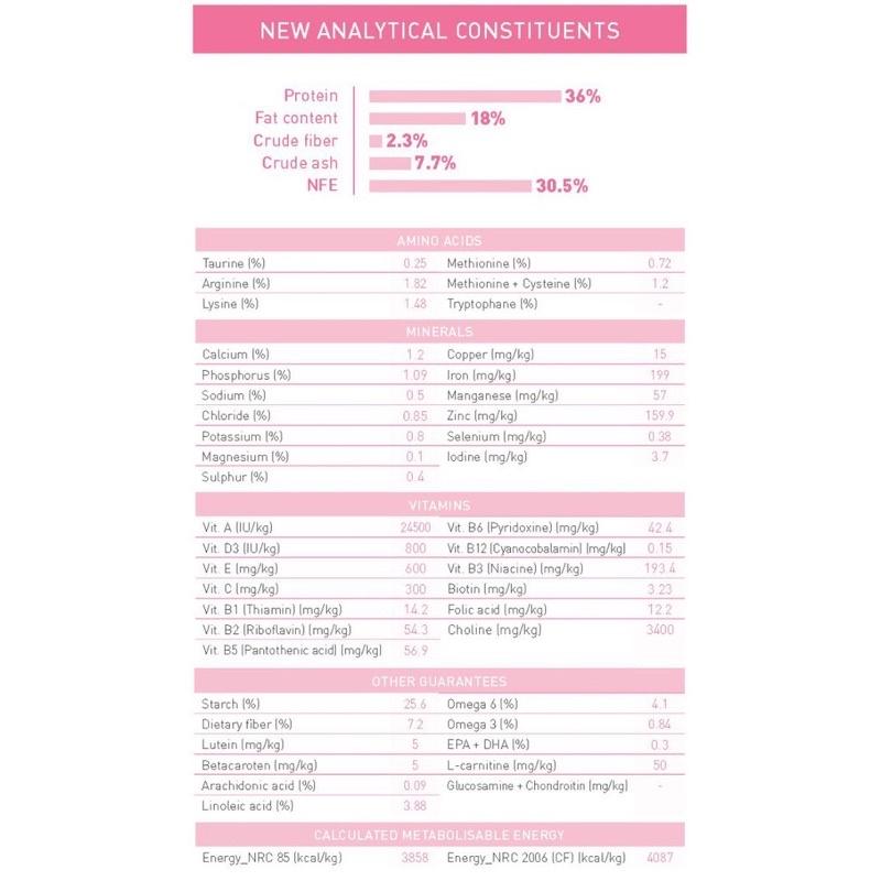 Mô tả sản phẩm Thành Phần: Hỗn hợp protein động vật (gà, cá), gạo, bắp, đậu nành, lúa mì, bột củ cải đường, dầu gà, men bia, cellulose, Calcium phosphate, muối, Lecithin, DL-Methionine, Choline Chloride,
