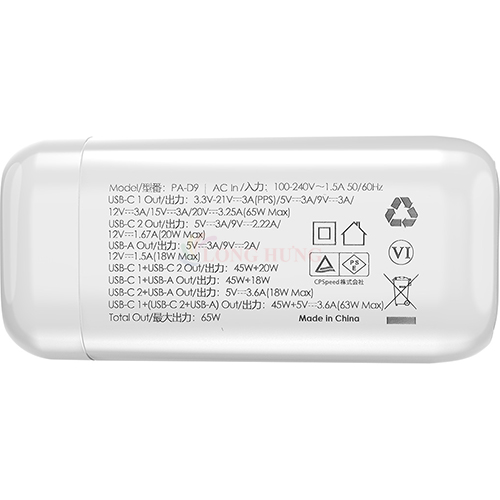 1. Input: 100-240V~50/60Hz 1A Max 2. Output: Single port: 5V/3A 9V/2.22A 12V/1.67A (20W Max) 3. Dual Ports: 5V/3A 9V/2.22A 12V/1.67A (20W*2) 4. Compatible with:PD3.0 (PD2.0) 5. QC4.0+ (QC4.0/QC3.0/QC2.0) SCP/FCP/AFC BC1.2--5V1.5A 6. UL,FCC, PSE,CE Certified