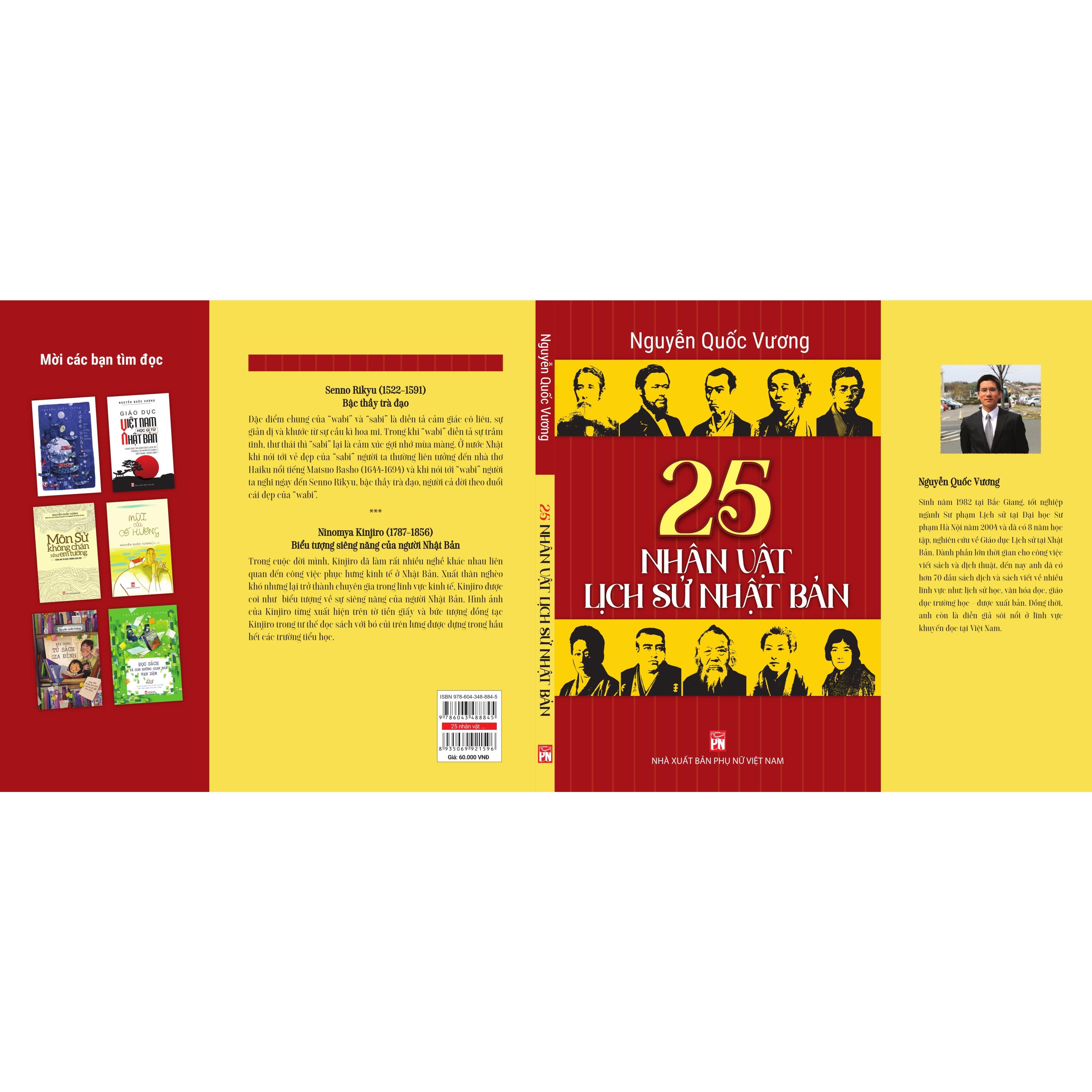 25 nhân vật lịch sử Nhật Bản, gồm 25 bài viết về các nhân vật làm nên lịch sử Nhật Bản từ cổ chí kim trên nhiều các lĩnh vực khác nhau: chính trị, khoa học, nghệ thuật, giáo dục... Những nhân vật được tác giả tuyển chọn dù là thiên tài quân sự, chính trị gia xuất sắc hay bậc thầy trà đạo hoặc người họa sĩ cô đơn đều là những nhân vật trở thành biểu tượng của Nhật Bản.
