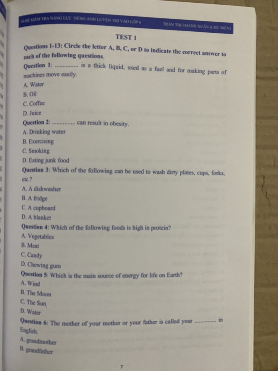 Mua tại TiktokNội dùng gồm có: Sách gồm 30 đề thi thử môn tiếng Anh, mỗi đề gồm 25 câu hỏi với các kiểu bài phong phú và đa dạng kiểm tra kiến thức về ngữ âm, từ vựng, ngữ pháp và bắt đầu làm quen với các bài tập viết ngắn. Phần cuối phần cuối cuốn sách này đã bán cho các đề thi Contents Test 1 Test 2 Test 3 Test 4 Test 5 Test 30 Answer keys Tác giả: Trần Thị Thanh Xuân, Phí Thị Hương Giang, Nguyễn Thu Trang, Nguyễn Thanh Vân, Hà Thu ngân, Trần Thị Oanh, Ts. Kasey Hames ( Hiệu đính ) Số trang: 219 Xuất bản: 2020 Nhà xuất bản: Đại học quốc gia Hà Nội Công ty phát hành: Nxb Đại học quốc gia Hà Nội