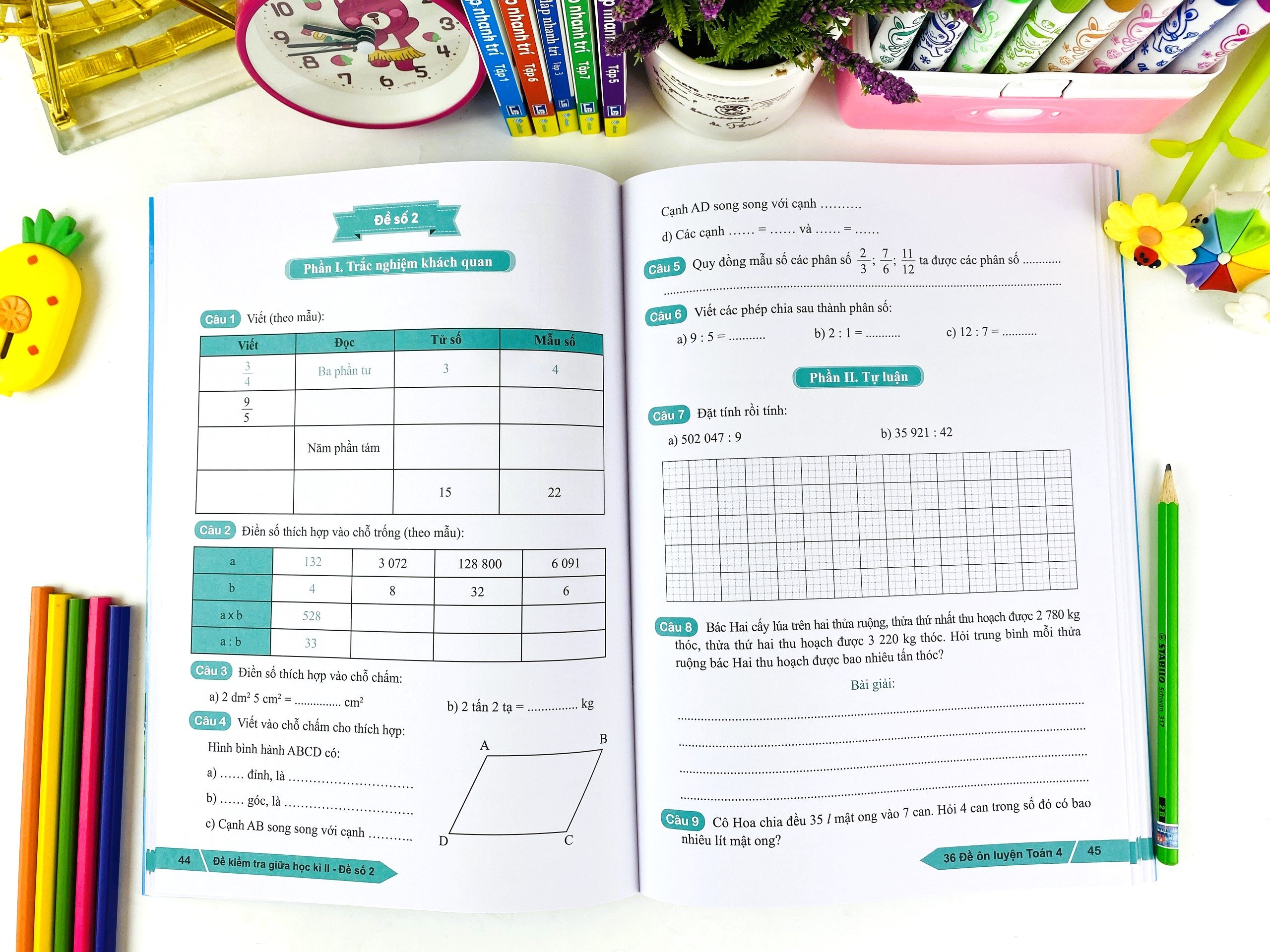 Phần thứ nhất là các đề kiểm tra: gồm 18 đề kiểm tra cuối kì 1 và 18 đề kiểm tra cuối kì 2. Riêng lớp 4 và lớp 5 được phân chia thành: