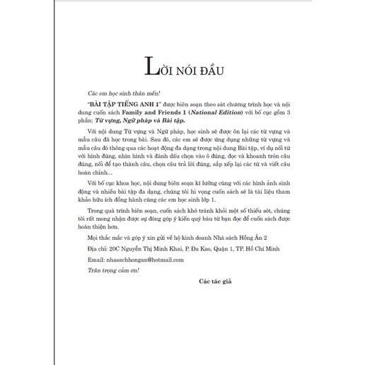 “BÀI TẬP TIẾNG ANH 1” được biên soạn theo sát chương trình học và nội dung cuốn sách Family and Friends 1 (National Edition) với bố cục gồm 3 phần: Từ vựng, Ngữ pháp và Bài tập.