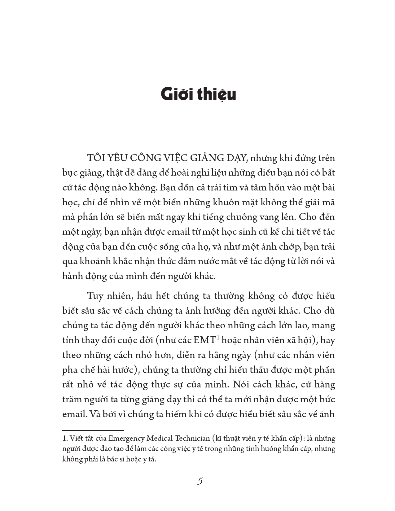 ầu hết chúng ta thường không có được hiểu biết sâu sắc về cách chúng ta ảnh hưởng đến người khác. Cho dù chúng ta tác động đến người khác theo những cách lớn lao, mang tính thay đổi cuộc đời, hay theo những cách nhỏ hơn, diễn ra hằng ngày, chúng ta thường chỉ hiểu thấu được một phần rất nhỏ về tác động thực sự của mình. Và bởi chúng ta hiếm khi có được hiểu biết sâu sắc về ảnh hưởng của bản thân đối với người khác nên có thể chúng ta đã thường xuyên đánh giá thấp mức độ ảnh hưởng của mình.