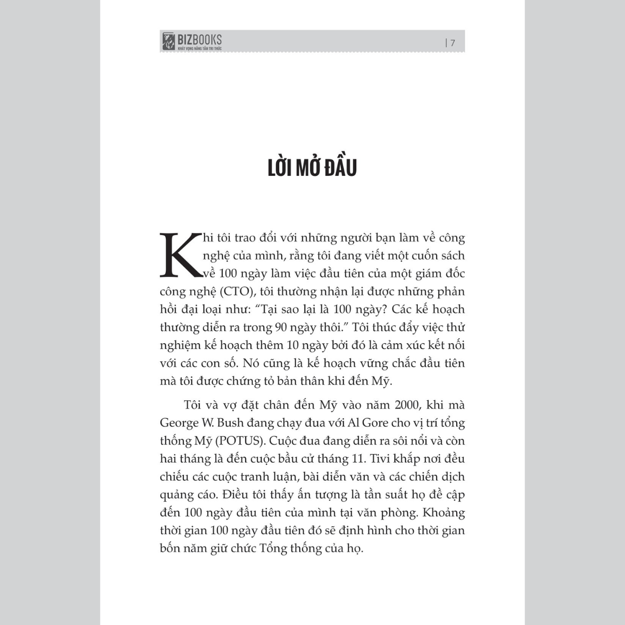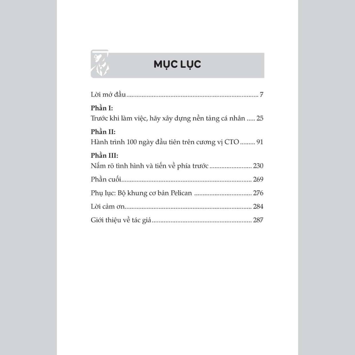 Cuốn sách được chia làm ba phần. Phần đầu tiên, bạn sẽ được hướng dẫn làm gì để chuẩn bị cho những cơ hội trở thành CTO tuyệt vời. Phần thứ hai, tác giả sẽ chỉ bạn trong 100 ngày làm thế nào để trở nên xuất sắc trong vai trò CTO. Và cuối cùng, một số thách thức mà bạn có thể phải đối mặt hằng ngày và cung cấp một số công cụ để giúp bạn vượt qua những thách thức đó.