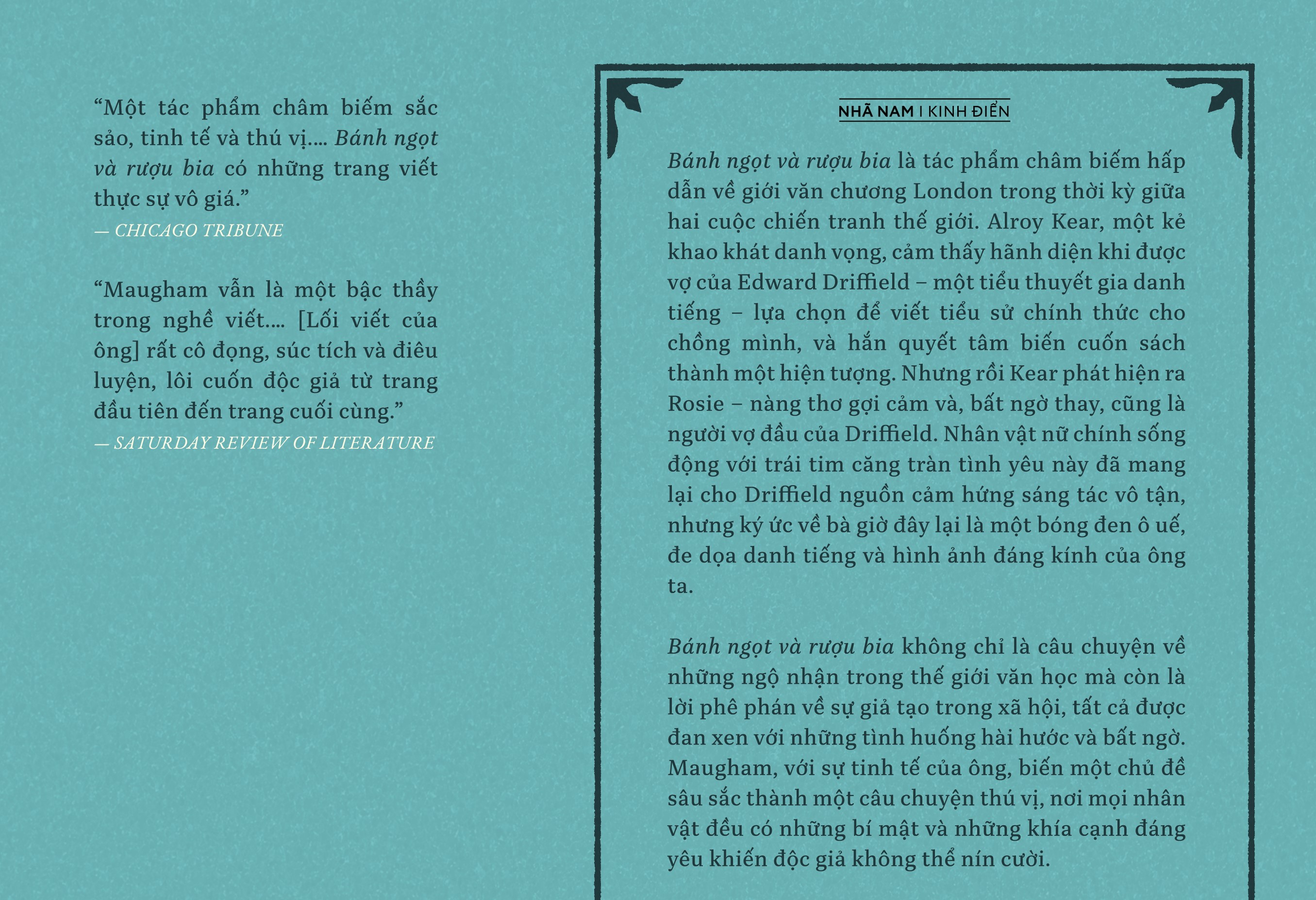 Bánh ngọt và rượu bia không chỉ là câu chuyện về những ngộ nhận trong thế giới văn học mà còn là lời phê phán về sự giả tạo trong xã hội, tất cả được đan xen với những tình huống hài hước và bất ngờ. Maugham, với sự tinh tế của ông, biến một chủ đề sâu sắc thành một câu chuyện thú vị, nơi mọi nhân vật đều có những bí mật và những khía cạnh đáng yêu khiến độc giả không thể nín cười.