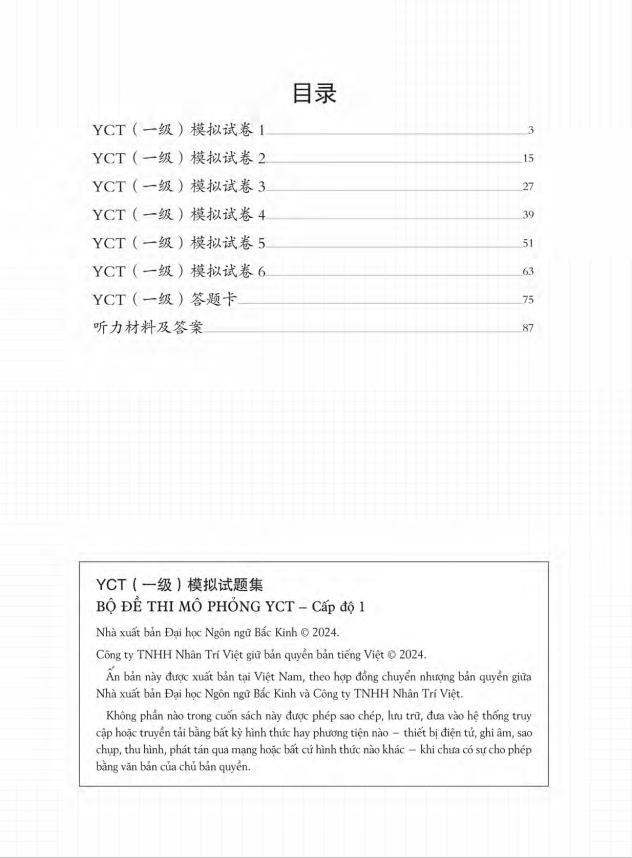 Mua tại TiktokBộ Đề Thi Mô Phỏng YCT Kỳ thi tiếng Trung dành cho học sinh (Youth Chinese Test – YCT) là kỳ thi chuẩn ở phạm vi quốc tế nhằm đánh giá khả năng sử dụng tiếng Trung trong cuộc sống hằng ngày cũng như trong học tập của học sinh tiểu học và trung học cơ sở có tiếng mẹ đẻ không phải là tiếng Trung. Bộ đề thi mô phỏng YCT gồm bốn quyển (tương ứng với các cấp độ từ 1 đến 4 của kỳ thi YCT), được biên soạn trên cơ sở bám sát những câu hỏi trong các đề thi YCT gần đây nhằm giúp học sinh ôn thi hiệu quả cũng như tự đánh giá trình độ của bản thân.