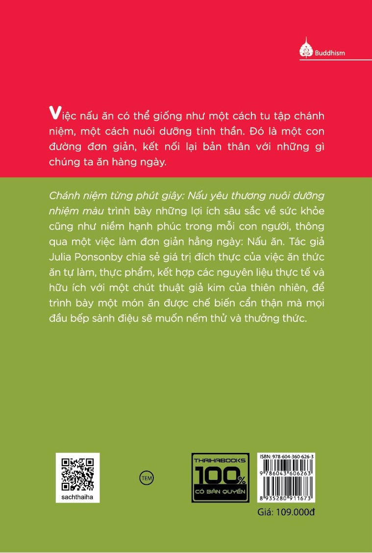 Đây là cuốn sách nằm trong bộ “Chánh niệm từng phút giây”. Cuốn sách gợi mở những suy nghĩ mới về nấu ăn - một trong những hoạt động thú vị nhất mà chúng ta thực hiện mỗi ngày – như một cách tiếp cận có “chánh niệm” hơn với cuộc sống.
