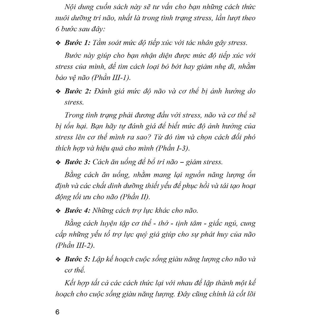 Cuốn sáchCHẾ ĐỘ ĂN BỔ TRÍ NÃO - GIẢM STRESSsẽ tư vấn cho bạn 6 bước để nuôi dưỡng trí não, nhất là khi trong tình trạng stress.
