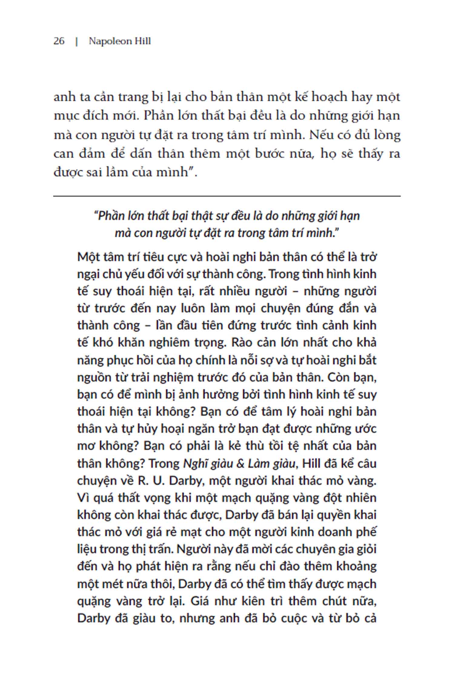 - Về tác giả: Napoleon Hill (1883 - 1970) là một tác gia người Mỹ, ông được coi là một trong những tác gia tiêu biểu thành công nhất trong lịch sử. Napoleon là một trong những người đầu tiên sáng tạo nên một thể loại văn học mới trong nền văn học hiện đại đó là văn học để phát triển thành công con người (self-help). Cuốn sách được biết đến nhiều nhất của ông là Nghĩ giàu & Làm giàu (1937), đã bán ra hơn 20 triệu bản in trên toàn thế giới (tính tới thời điểm ông mất năm 1970). Cho tới nay, cuốn sách này vẫn đang được dịch ra nhiều thứ tiếng trên thế giới và trở thành cuốn sách gối đầu giường của rất nhiều độc giả. Ngoài ra, Napoleon Hill còn từng được mời làm cố vấn cho Tổng thống Mỹ Franklin D.Roosevelt từ năm 1933 đến năm 1936. Ông rất nổi tiếng với câu nói "Những gì tâm trí có thể nhận thức được và tin tưởng thì nhất định tâm trí sẽ làm được". Những thành tựu mà ông đã đạt được cũng như các công thức thành công mà ông đề cập tới đều có ảnh hưởng rất lớn tới nhiều thế hệ độc giả.