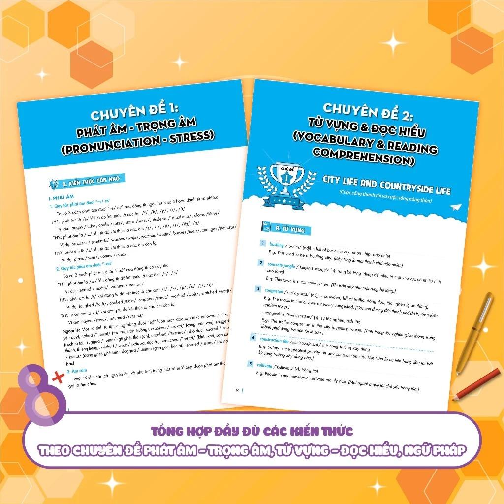 Chinh phục 8+ luyện thi vào lớp 10 môn Tiếng Anh theo chủ đề (sách ôn luyện cho các bộ sách giáo khóa mới)là cuốn sách trong bộ sách “Chinh phục 8+ luyện thi vào lớp 10 theo chủ đề” được biên soạn bởi các tác giả uy tín và nhiều năm kinh nghiệm giảng dạy, luyện thi vào lớp 10. Cuốn sách được tổng hợp bài bản, cập nhật mới nhất các nội dung được đưa vào đề thi mônTiếng Anh, bám sát ma trận đề mới nhất của Bộ Giáo dục thi vào 10 năm 2025, chắc chắn sẽ giúp các em vững vàng kiến thức, tự tin đạt điểm cao trong kỳ thi sắp tới.