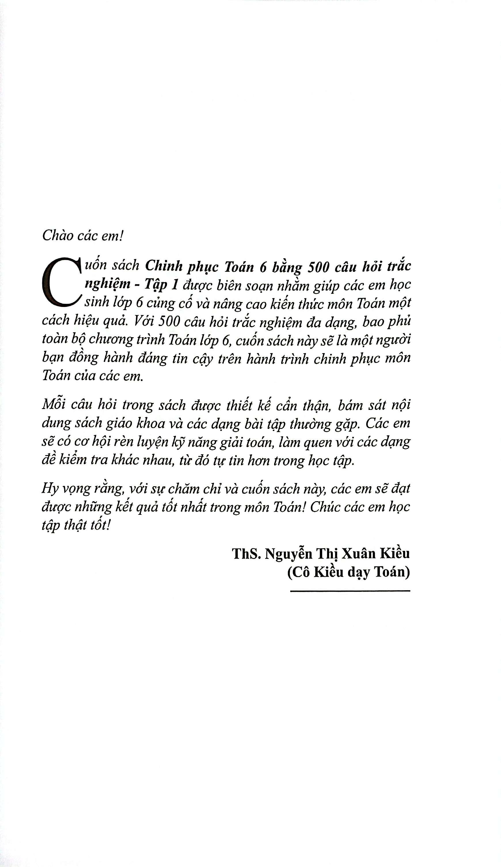 Hy vọng rằng, với sự chăm chỉ và cuốn sách này, các em sẽ đạt được những kết quả tốt nhất trong môn Toán! Chúc các em học tập thật tốt!